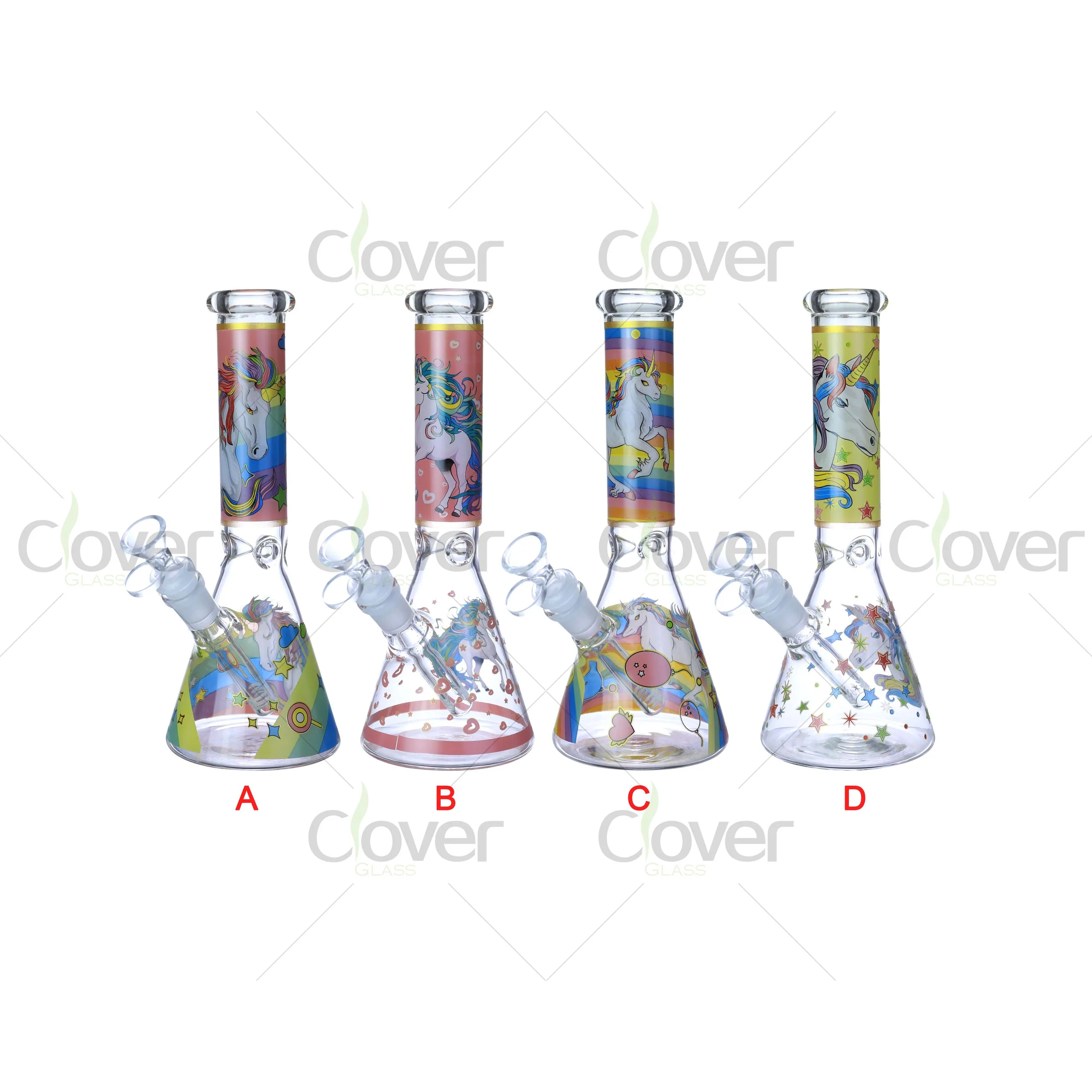 Each style (A–D) blends colorful designer prints with glow-in-the-dark outlines, turning every night session or shelf display into a conversation starter. Crafted from 4mm borosilicate glass, each piece includes a 14mm female joint and removable downstem for smooth, cool hits.