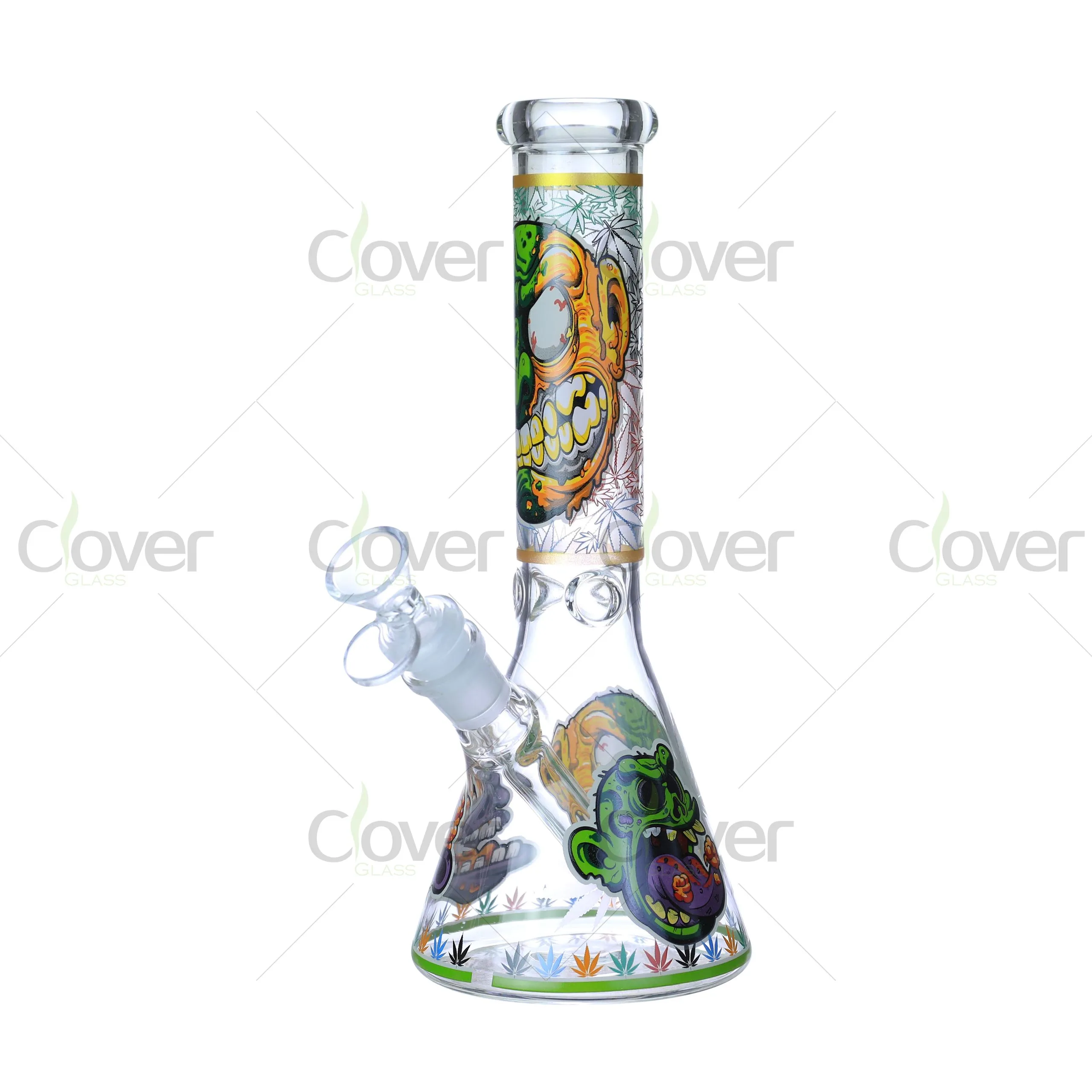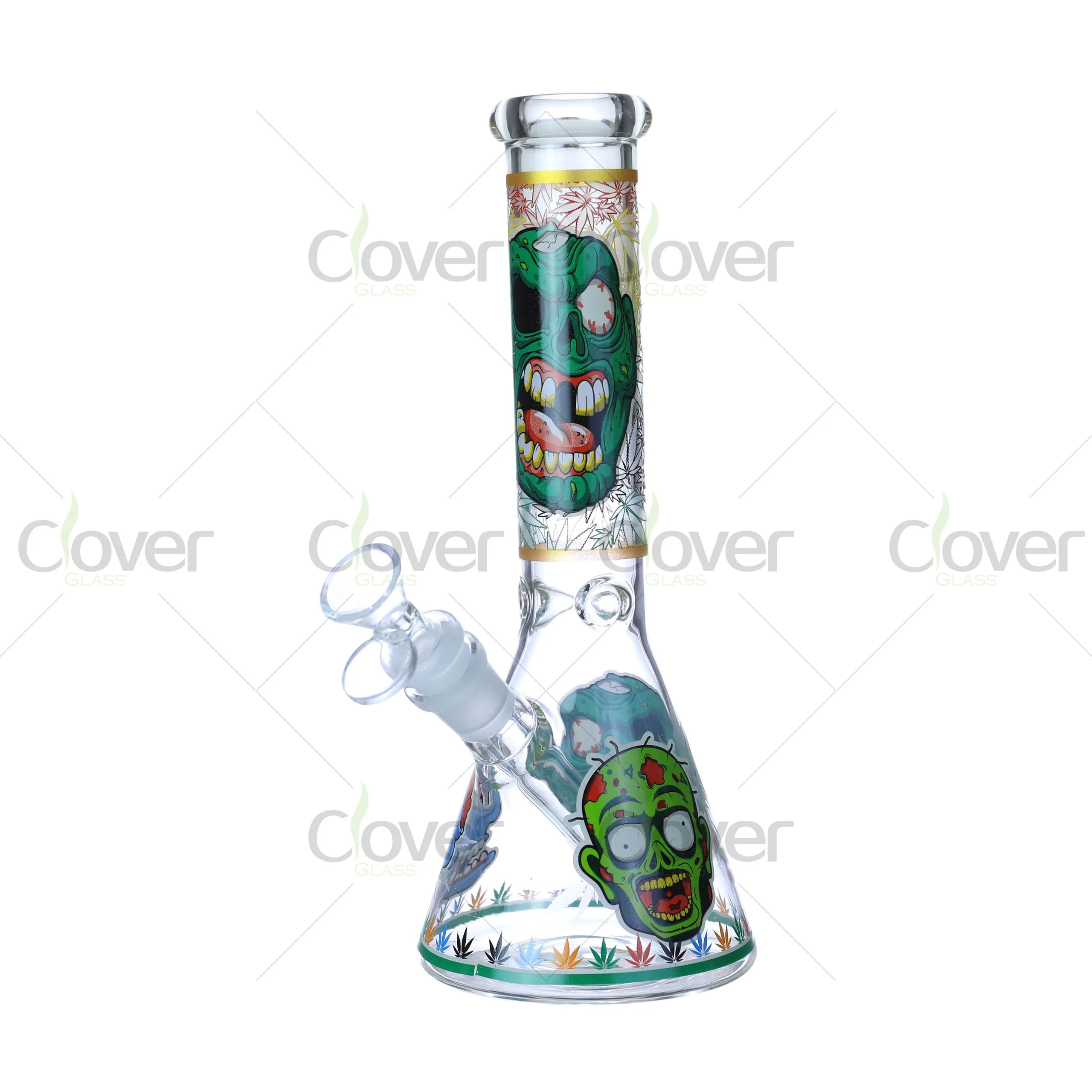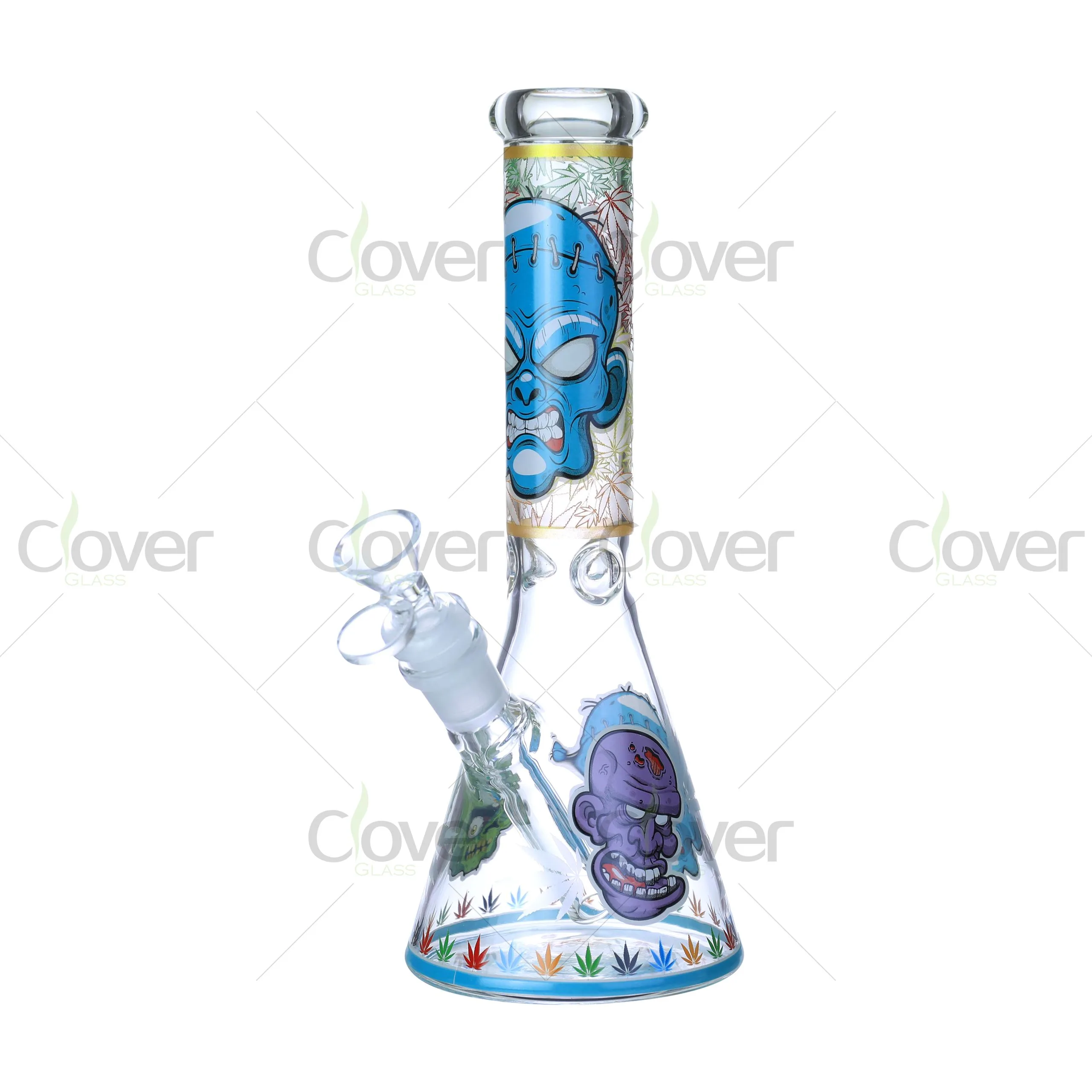 Inject some undead energy into your display with Clover’s Zombie Skull Glow Beaker Bong Series. These 10 inch water pipes feature grotesque and comical skull designs in street-art cartoon style—each illuminating under blacklight thanks to embedded glow-in-the-dark ink.