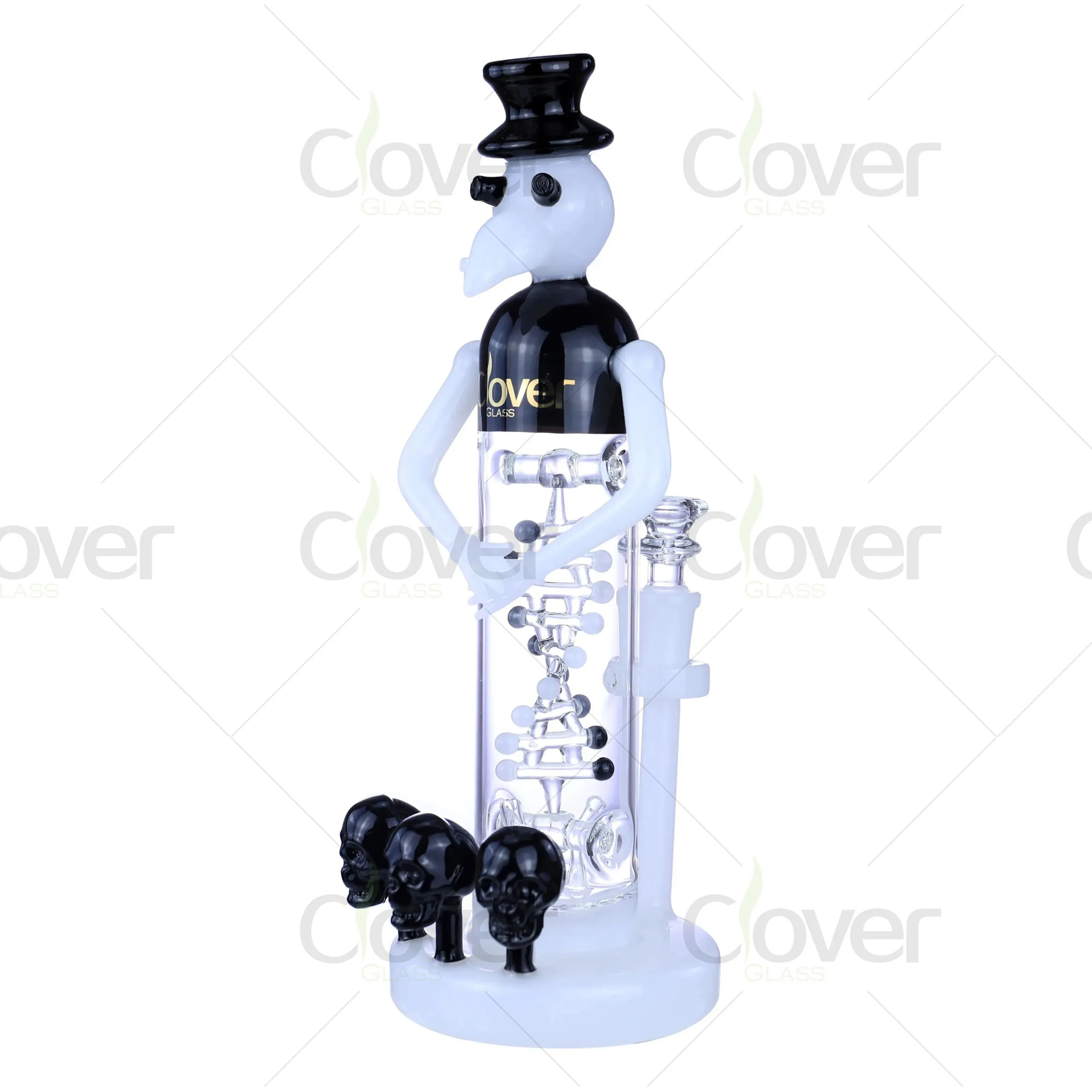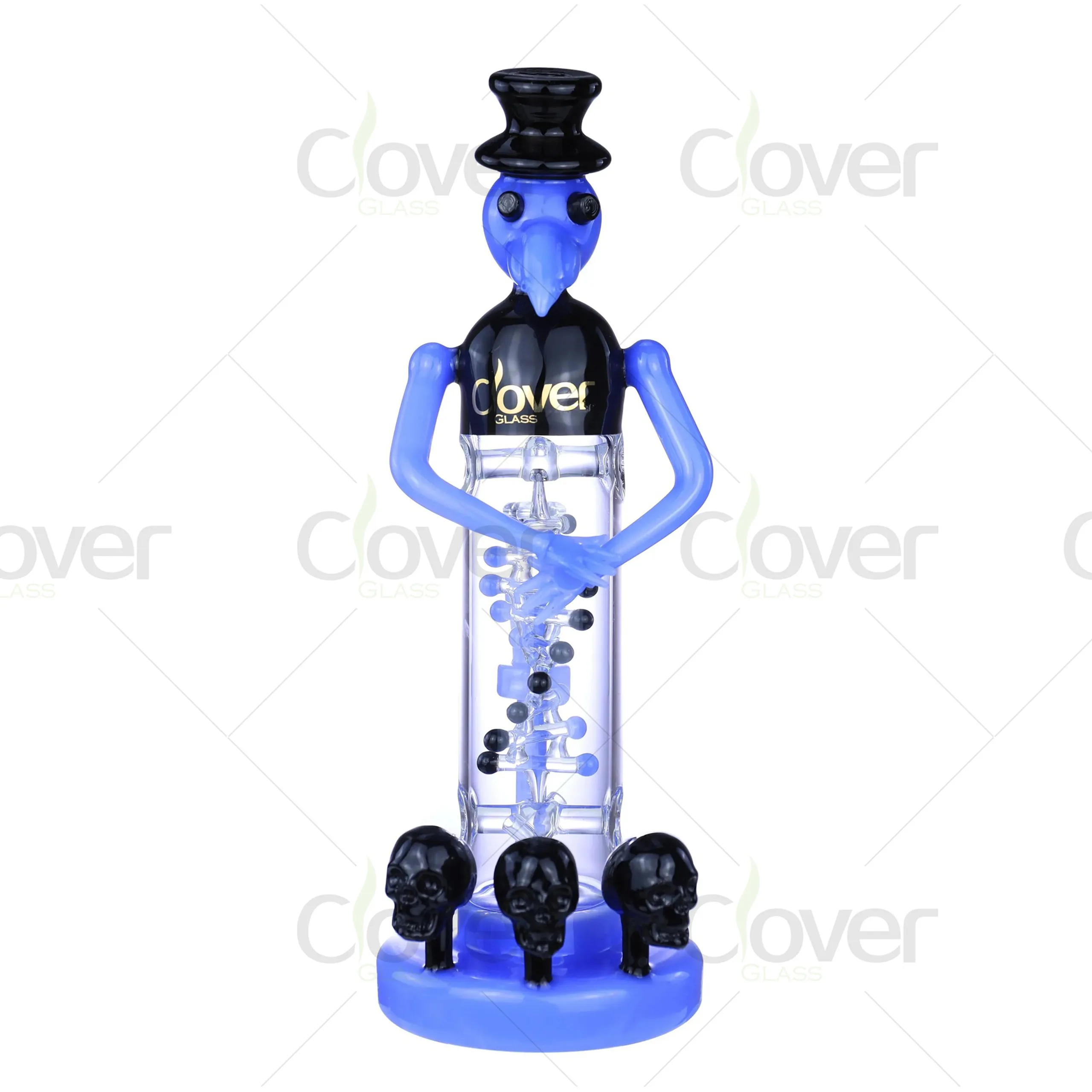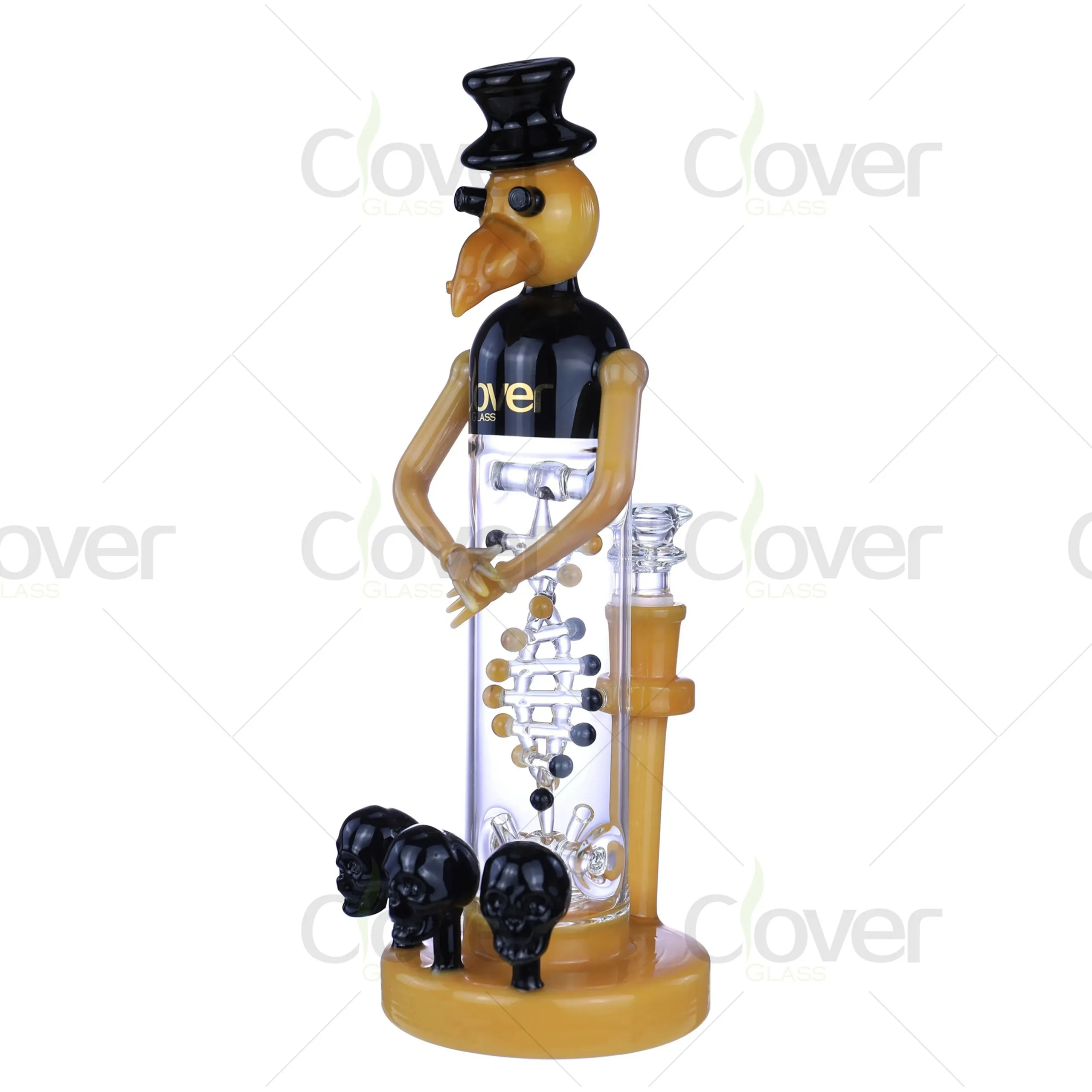 The detailed craftsmanship includes a stack of intricately designed percolators for smooth filtration and skull-shaped accents on the base, adding to its striking aesthetic appeal. Whether for personal use or display, this piece is guaranteed to captivate attention.