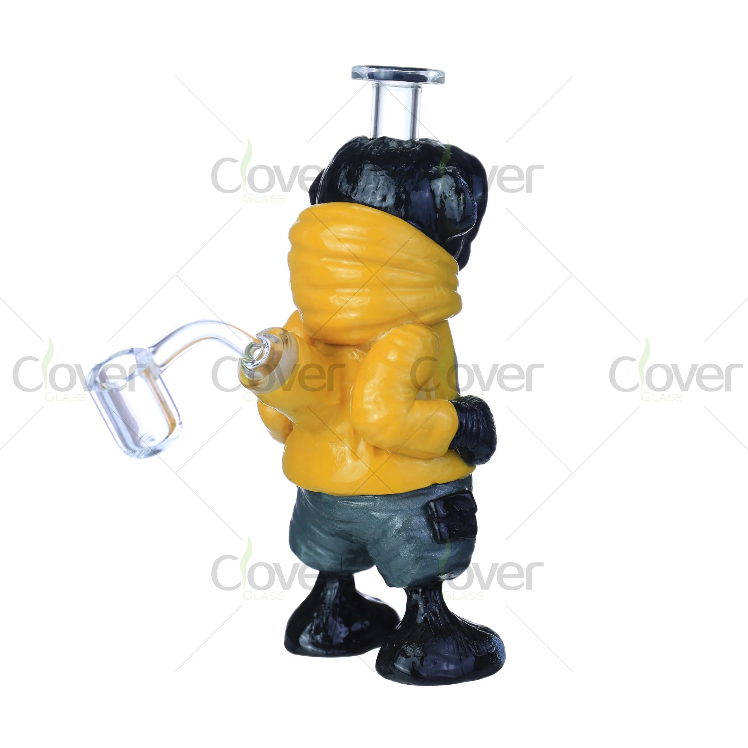 Meet the Glow-in-the-Dark Monkey Character Bong, a unique piece that blends playful design with serious functionality. Standing at 11 inches tall, this dab rig is crafted from 5mm thick borosilicate glass, making it both stylish and durable. The standout feature is the detailed 3D printed monkey figure, dressed in a yellow hoodie and shorts, with eyes that glow in the dark for an unforgettable smoking vibe.
