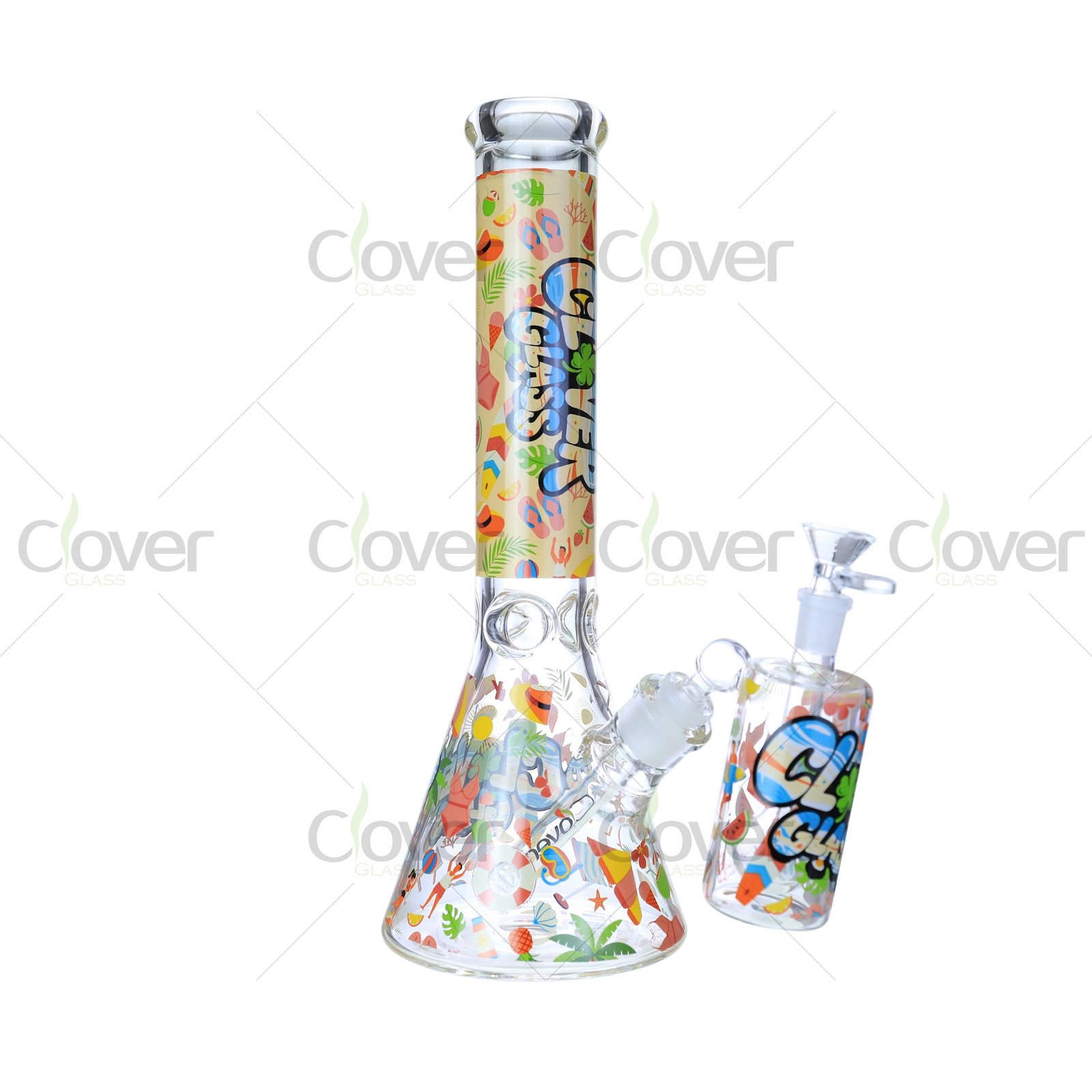 The bold full-color summer theme decal covers the neck and base with tropical visuals, while the large Clover Glass logo reinforces brand identity. Each set includes a matching ash catcher, designed with the same vibrant artwork for a unified, high-end retail look.