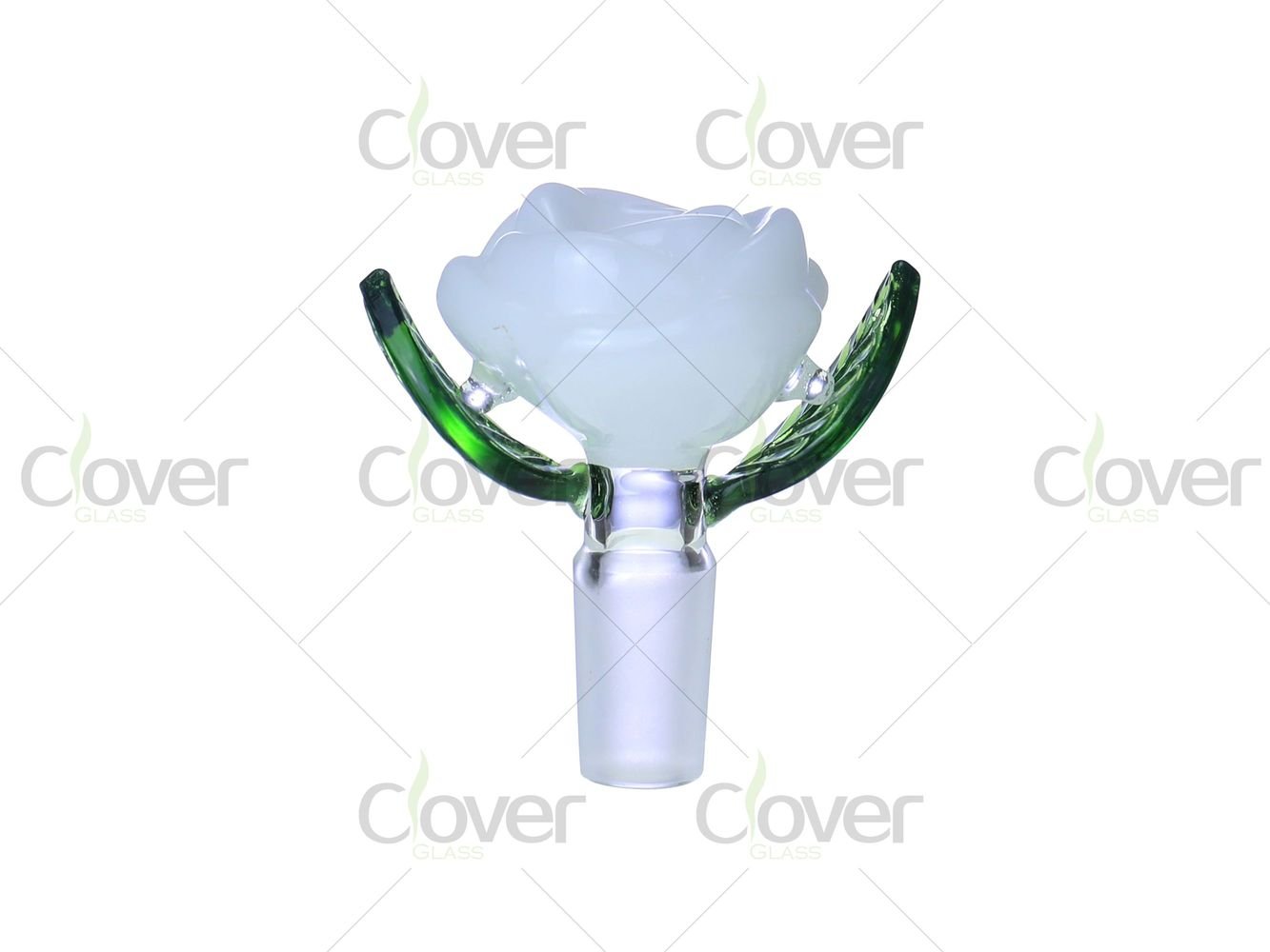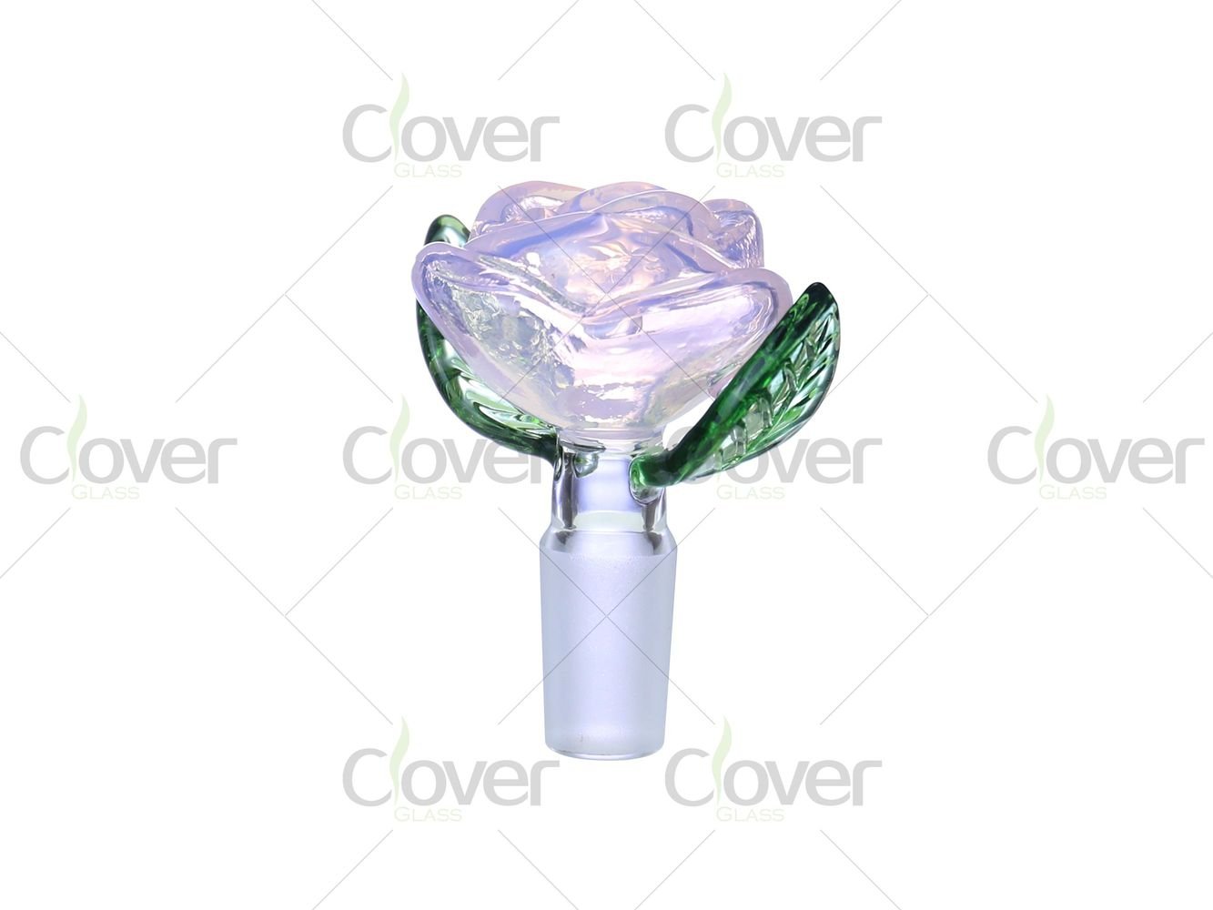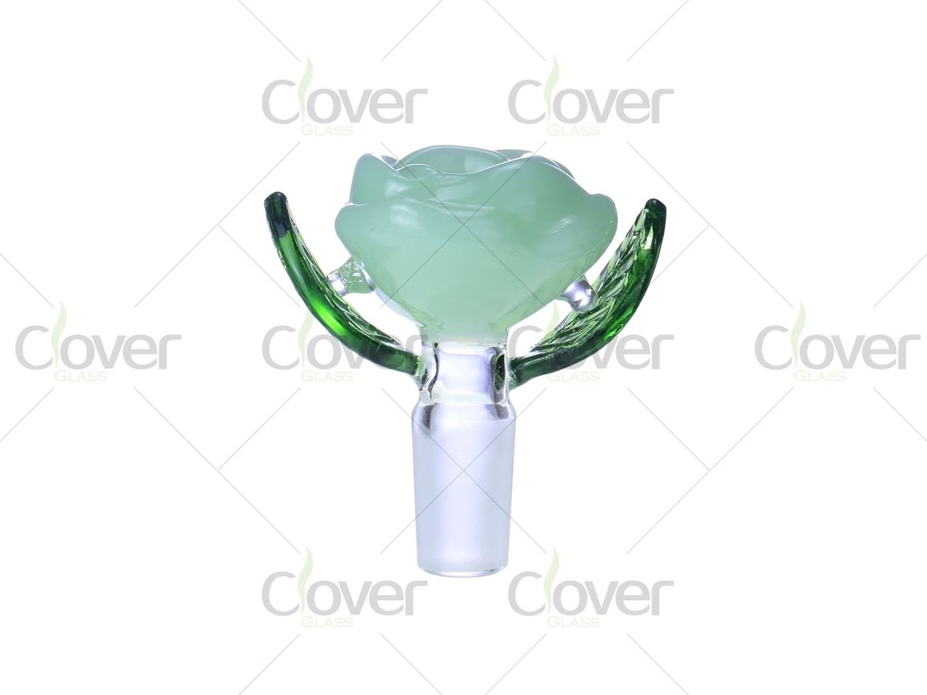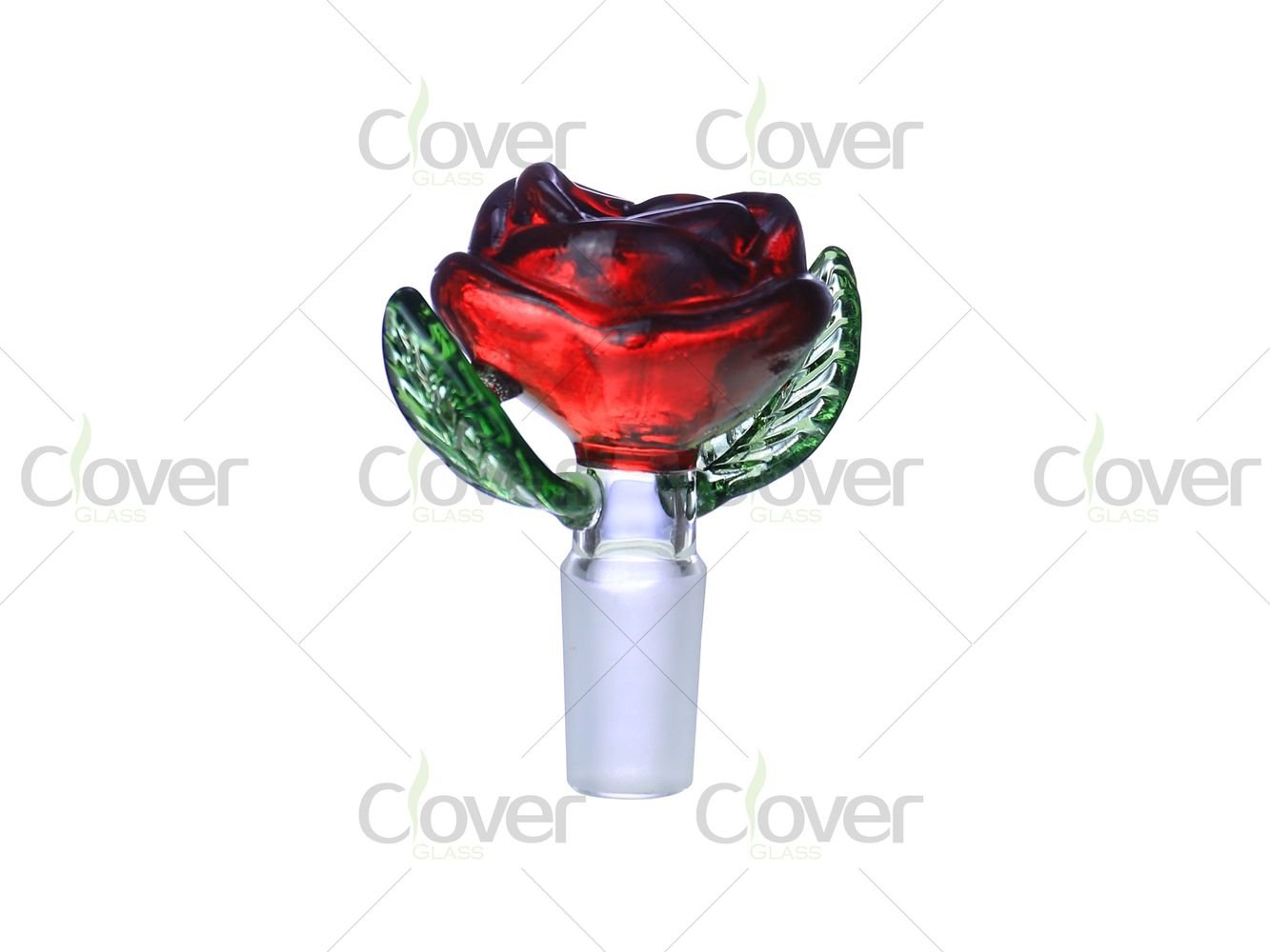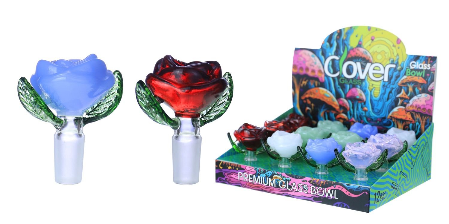 This 14mm glass bowl features a detailed rose flower design, combining decorative artistry with everyday functionality. The bowl cup is shaped like a blooming rose, while the sculpted green glass leaves act as natural side grips, adding both visual depth and practical handling support.