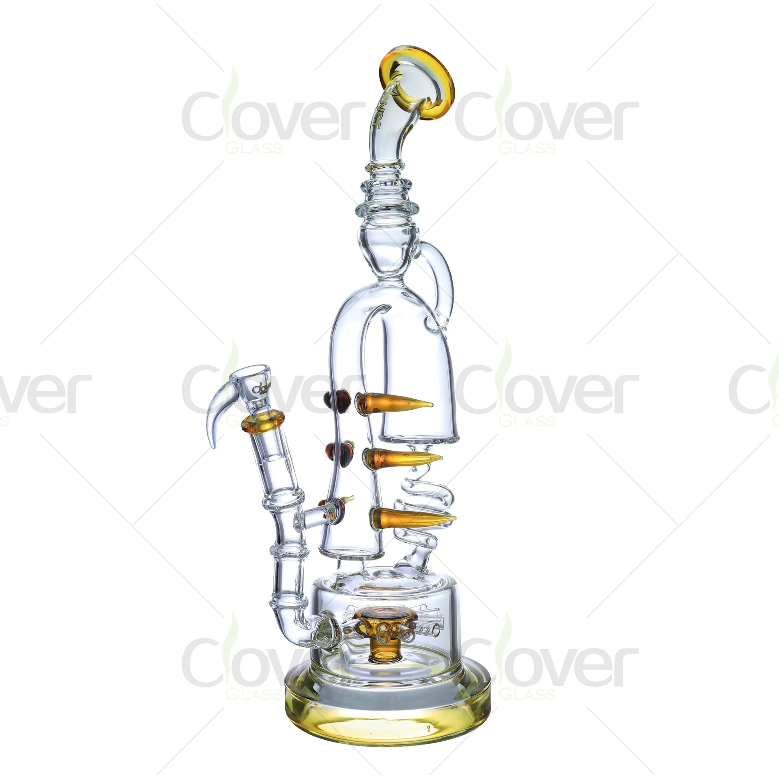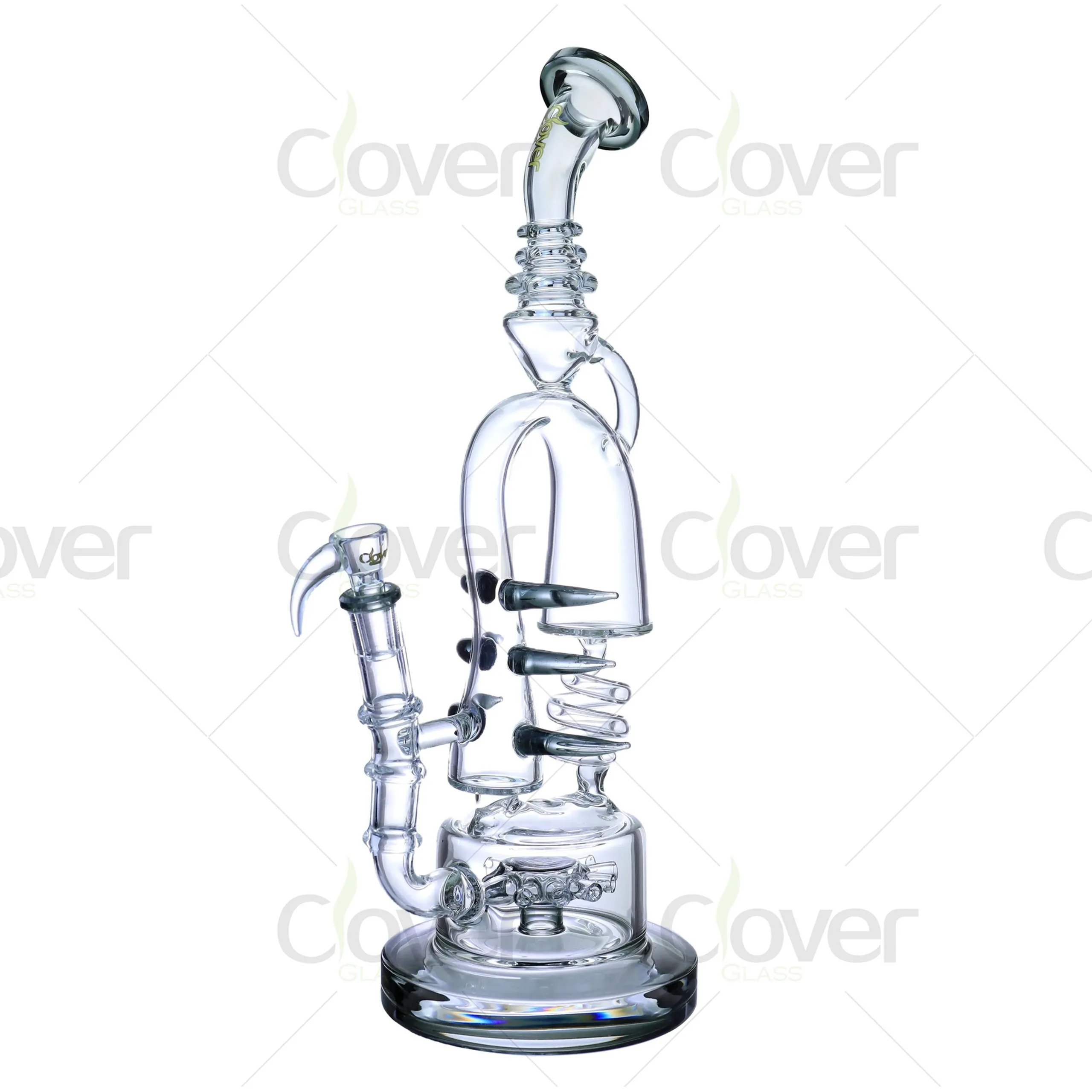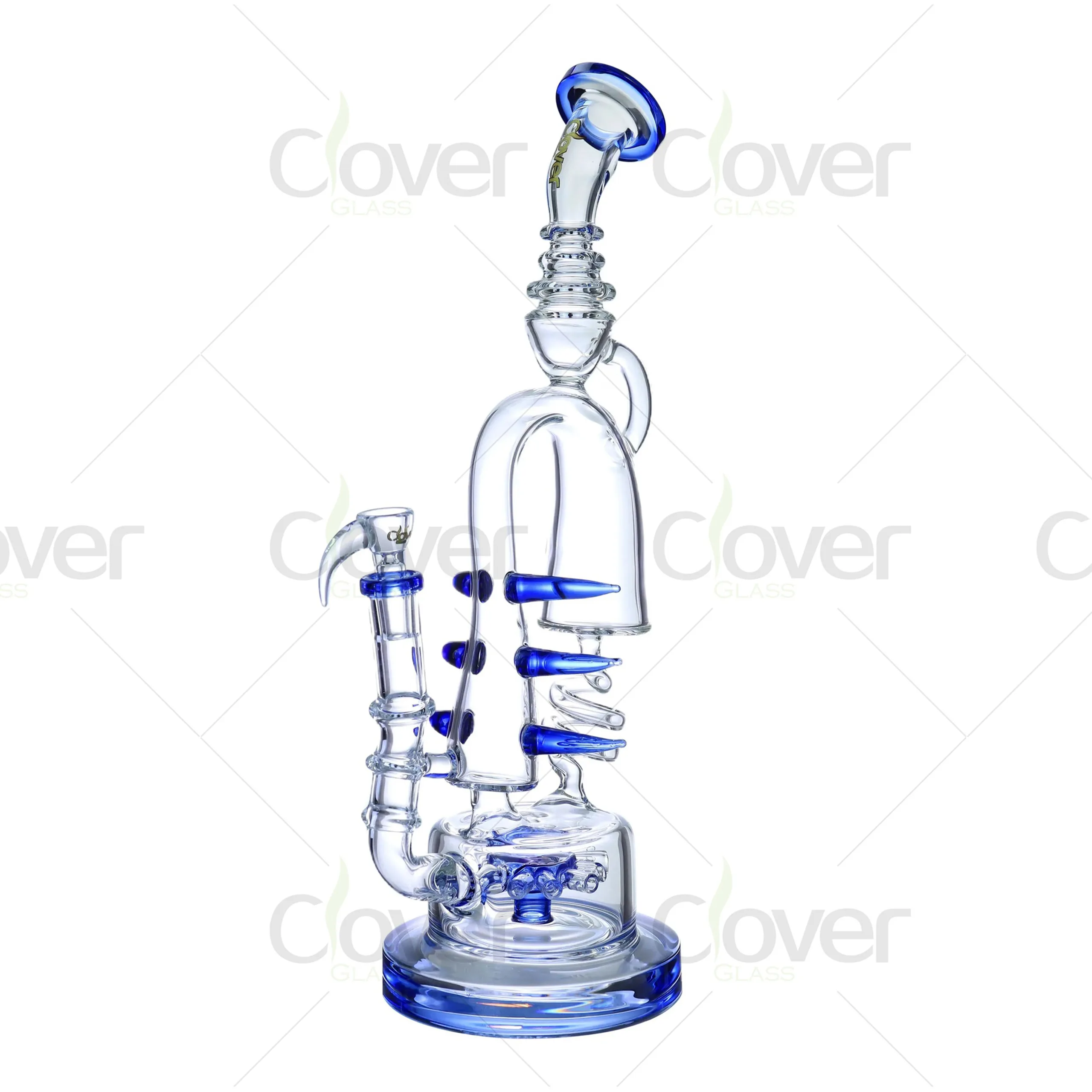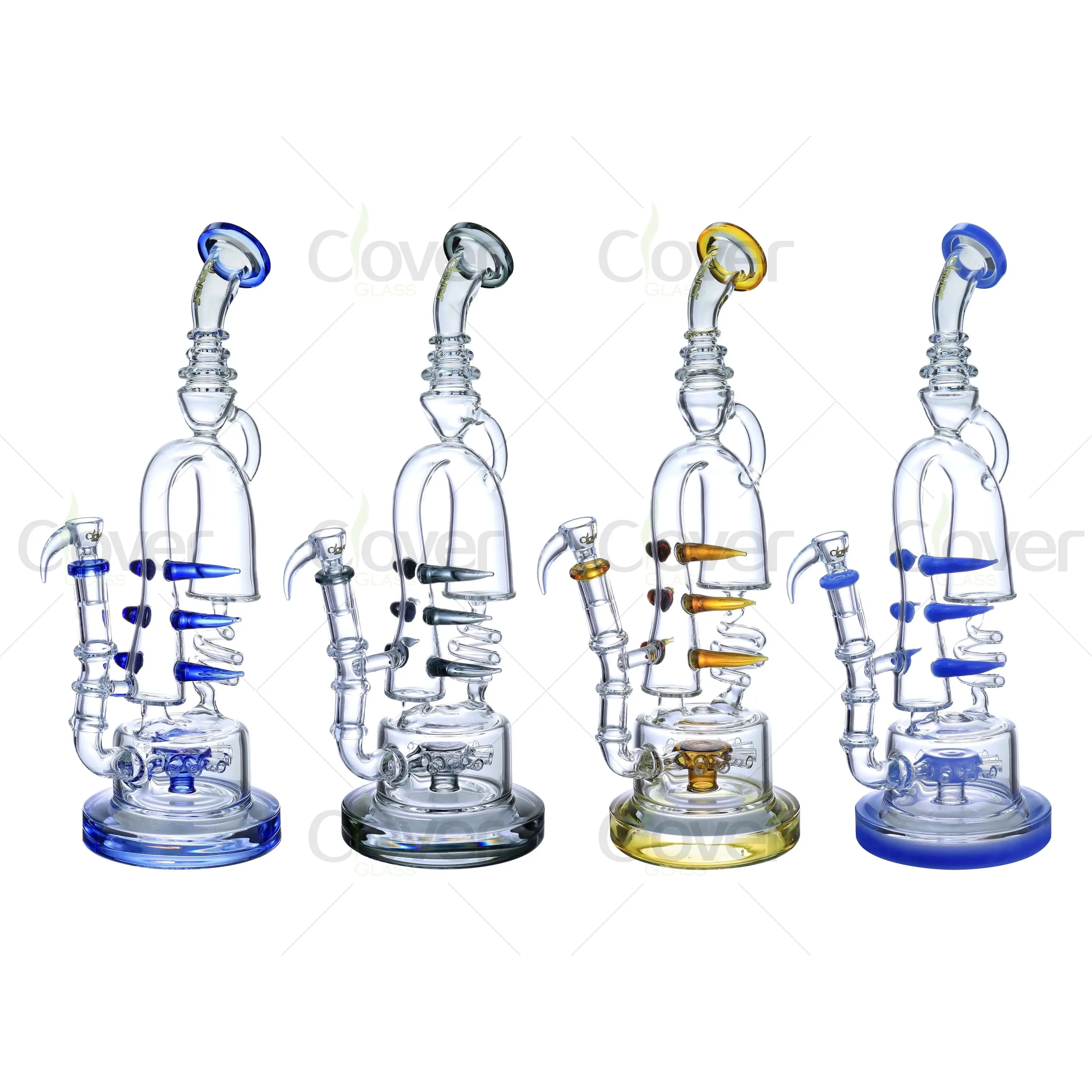 This 15.55-inch spiral recycler glass bong combines elegance and functionality, offering a premium smoking experience. The intricate spiral arms and recycler system enhance smoke filtration, resulting in smoother, cooler hits. The artistic design is complemented by color accents available in blue, black, amber, and clear, making it a visually stunning addition to any collection.