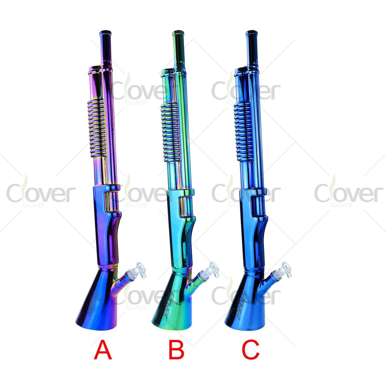 Make a bold statement with this giant shotgun-shaped glass water pipe, standing an impressive 26.37 inches tall and crafted in a hyper-realistic pump-action design. This ultra-creative piece is finished with an eye-catching electroplated rainbow sheen, offering a chrome-like metallic shine in every color angle. It’s not just large — it’s legendary.