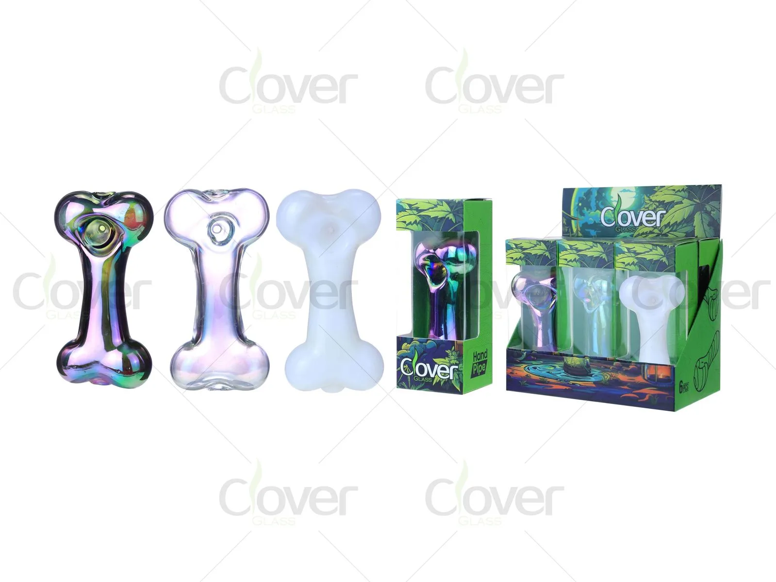 Each hand pipe is crafted from thick glass and finished in mixed colors, including solid, frosted, and iridescent styles. The novelty bone shape and varied finishes create strong visual appeal when displayed together.