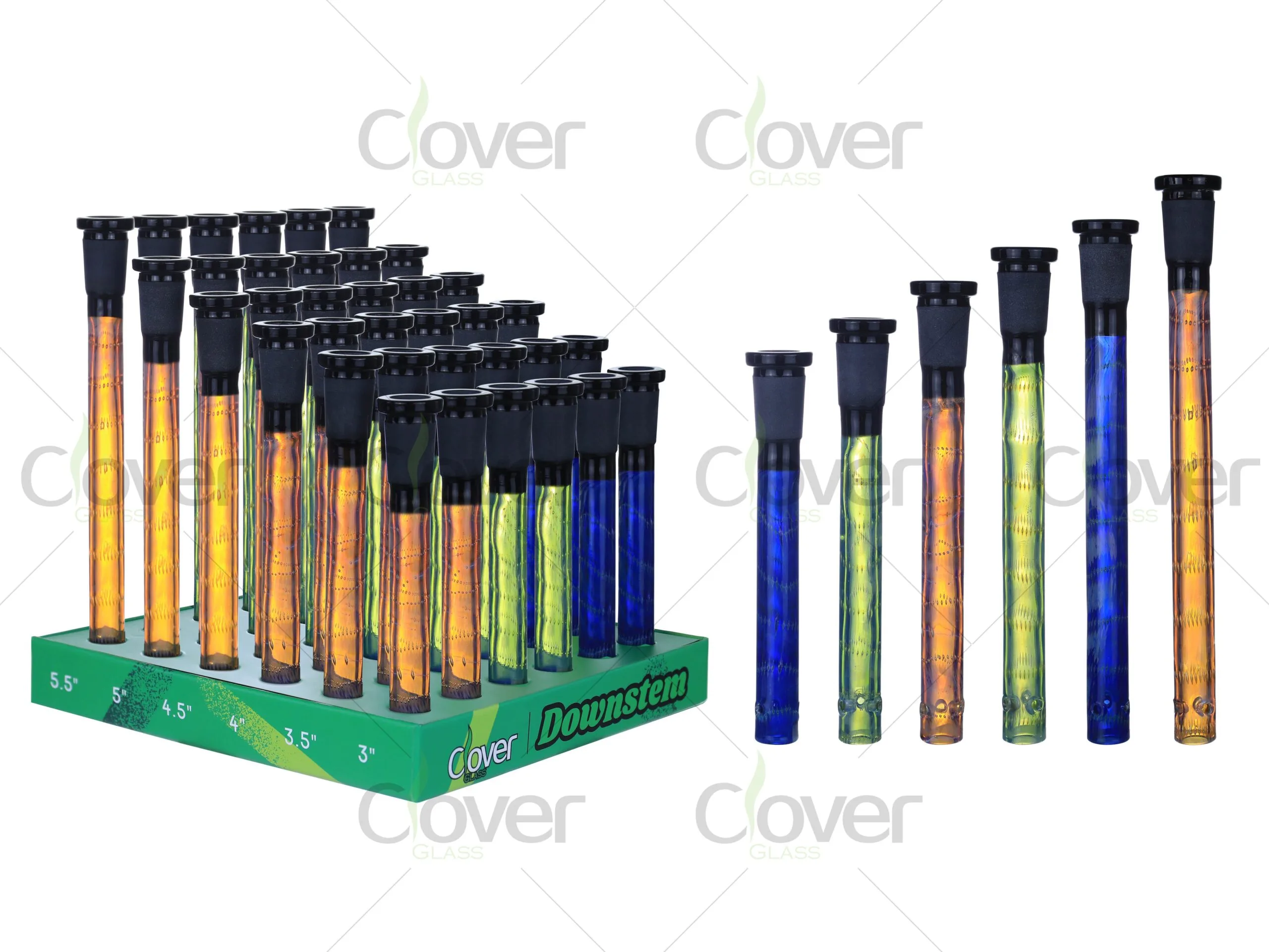 This retail-ready display box includes six different sizes (3" to 5.5"), making it the perfect choice for smoke shops, wholesalers, and distributors. The vibrant color options, including amber, green, and blue, add a stylish touch, while the black top ensures a secure fit in most bongs.