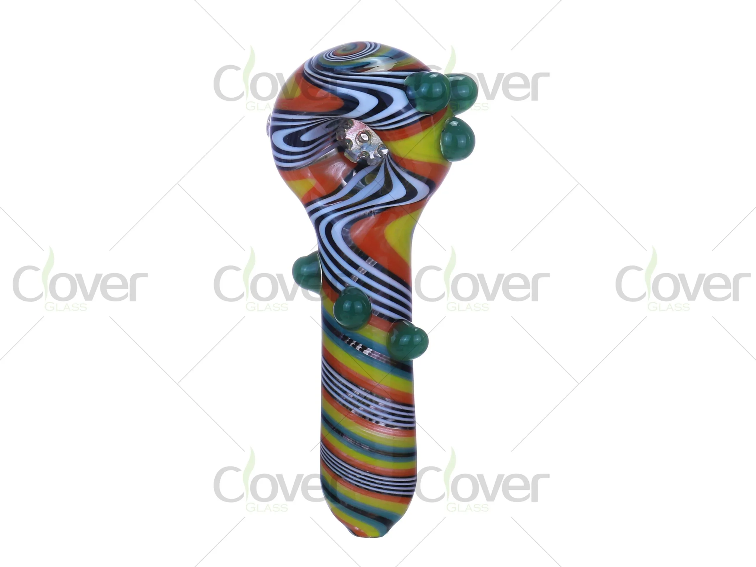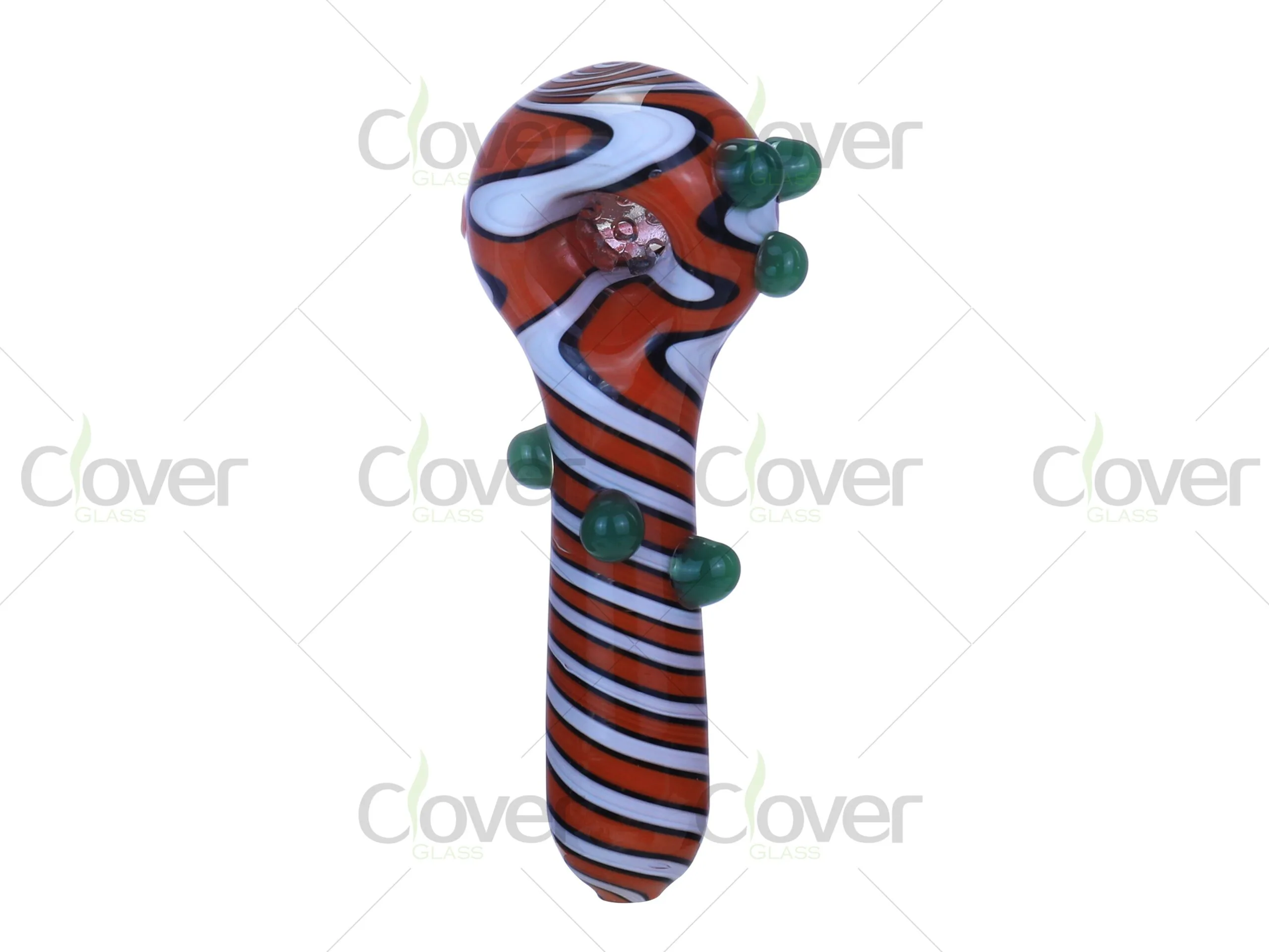 The 4.17 Inch Glass Hand Pipe by Clover Glass features an eye-catching colorful swirl design with vibrant hues of orange, red, black, and white, adding a dynamic look to your smoking experience. The pipe is accentuated with green decorative marbles, providing both a stylish appearance and functional grip. This pipe is perfect for those who appreciate a combination of aesthetics and performance.