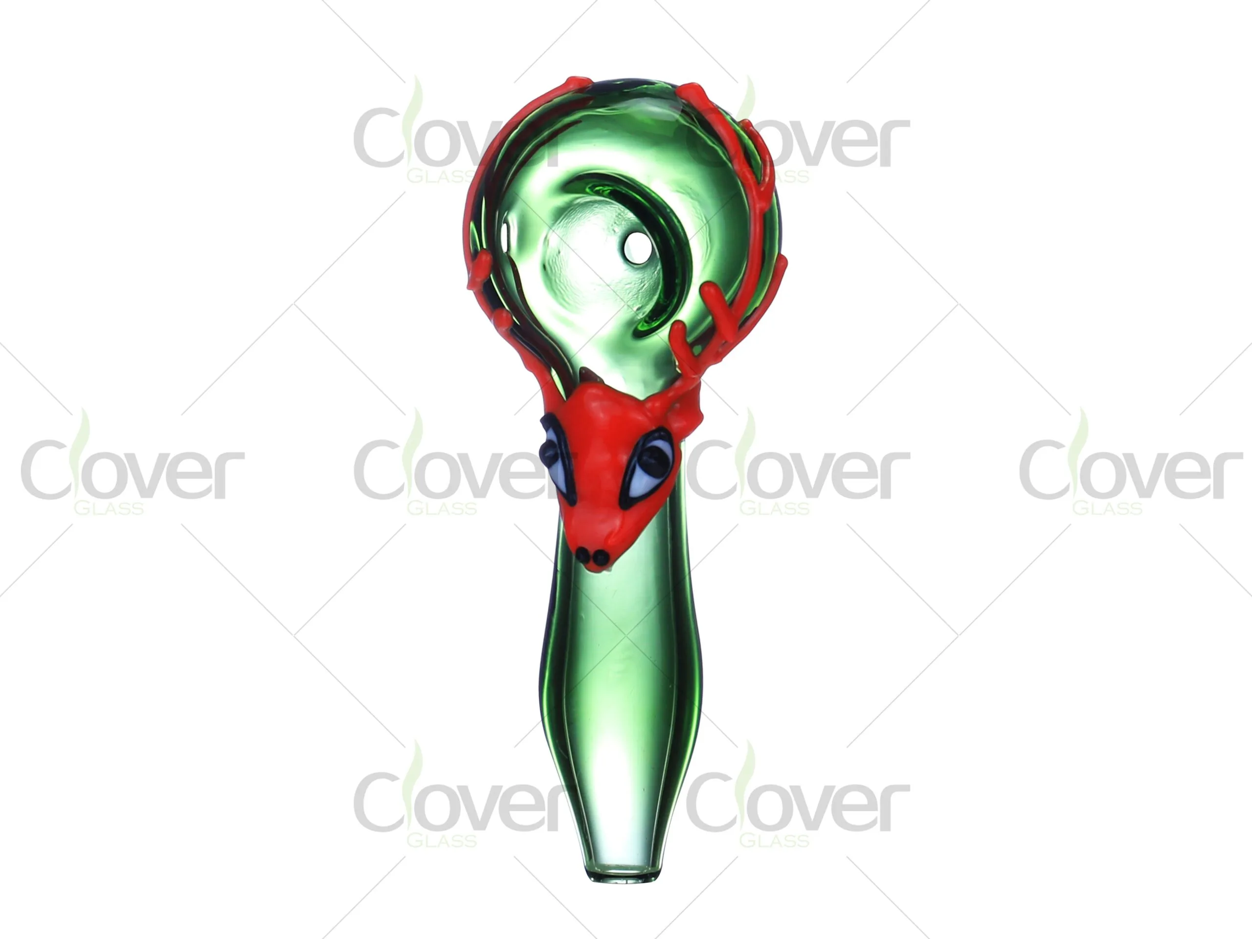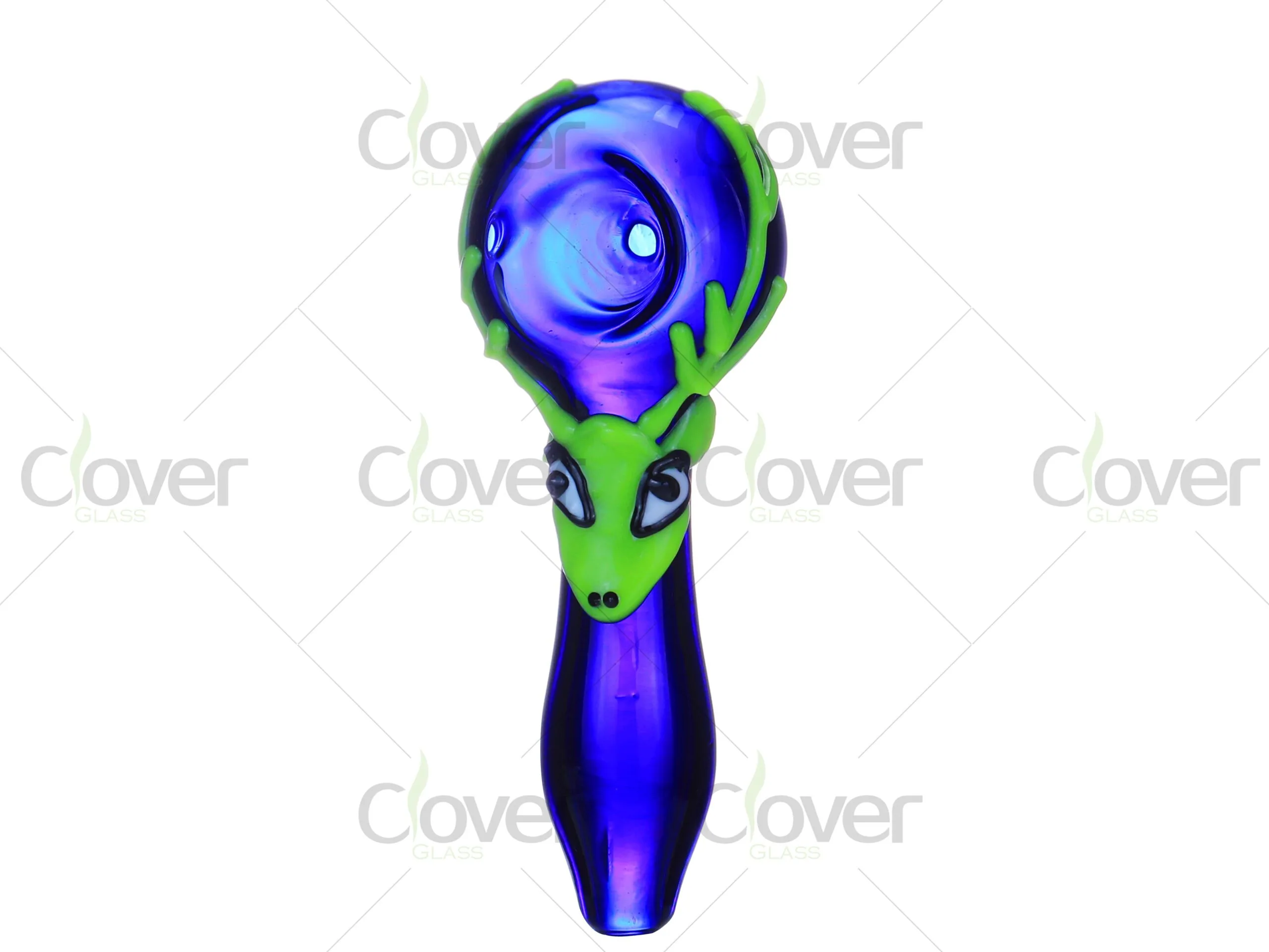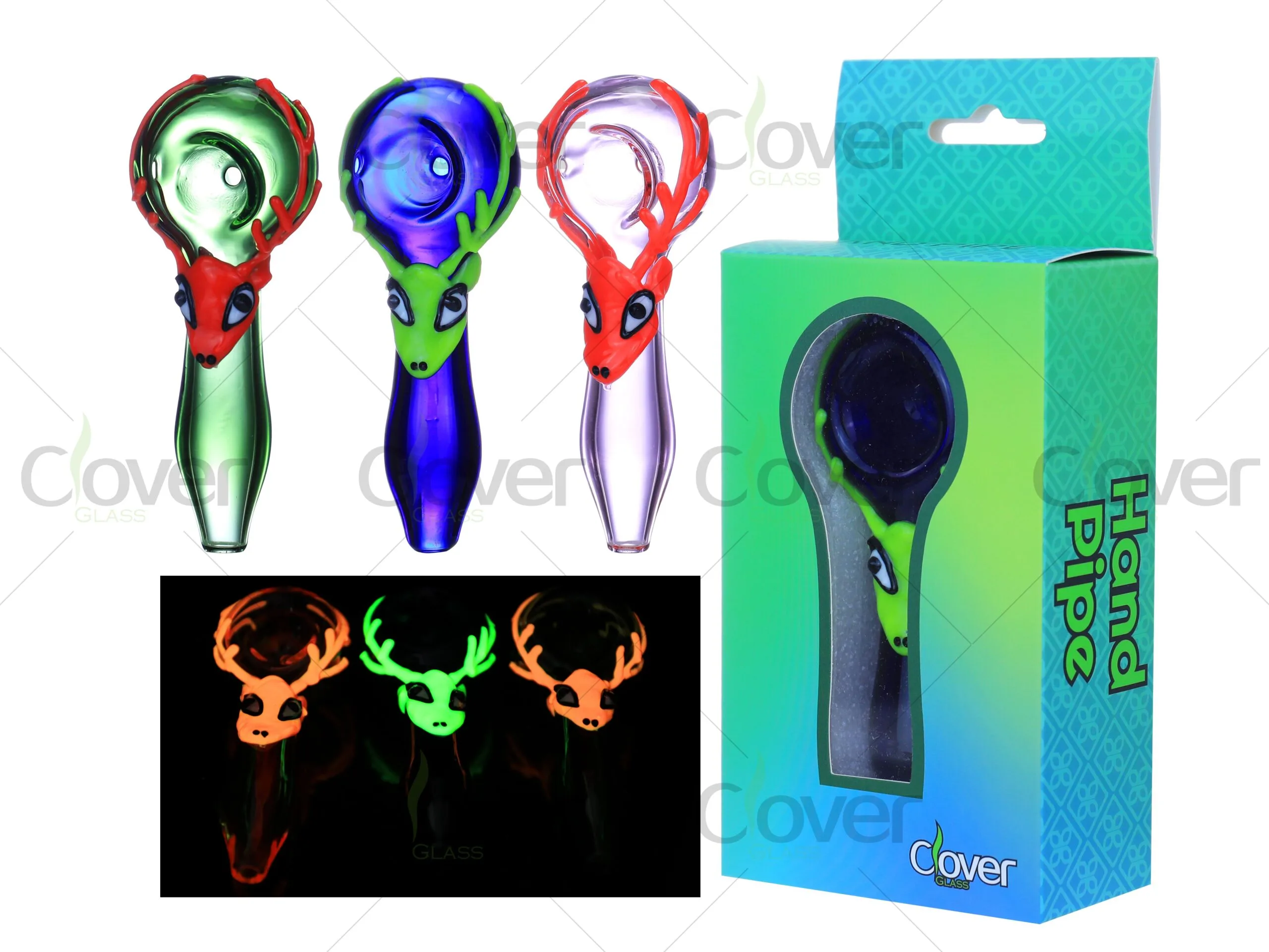 The 4.17 Inch Glass Hand Pipe by Clover Glass features a glow-in-the-dark deer design, making it a fun and functional smoking accessory. Available in vibrant colors like green, blue, and purple, this pipe is accented with a colorful deer face, adding a playful touch to your collection. The glow feature ensures that it stands out even in low light, creating a unique visual effect.