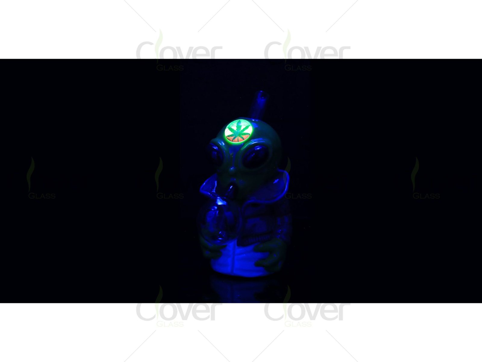 Meet your newest out-of-this-world bestseller: the 4.3-inch alien-themed glass oil burner pipe, featuring a neon green extraterrestrial rocking a brown jacket, teal pants, and oversized black eyes. Topped with a colorful cannabis leaf emblem, this cosmic visitor glows bright blue and green under UV light, making it a perfect pick for party smokers and collectors.