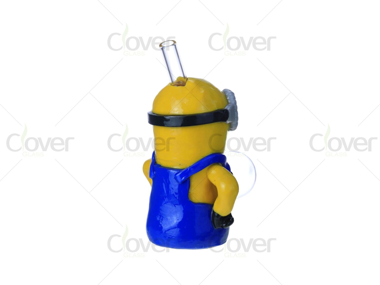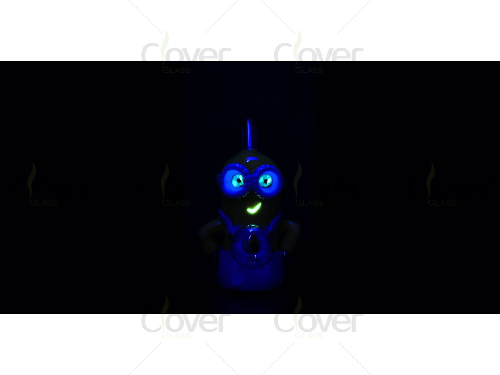 This 4.3-inch cartoon-inspired oil burner pipe brings fun and function together in one eye-catching piece. Sculpted and hand-painted to resemble a playful yellow minion figure in blue overalls and signature goggles, this design offers instant retail charm. The standout feature? Its UV-reactive paint glows under blacklight—illuminating the goggles and smile in glowing neon for extra nighttime appeal.