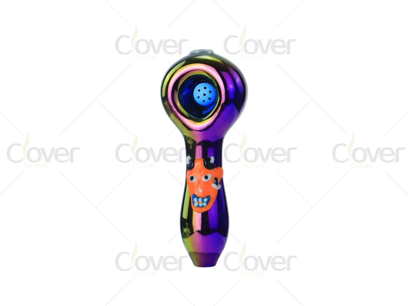 This 4.37-inch glass hand pipe features a compact rounded body combined with playful cartoon-style glass accents and a glow-in-the-dark effect, making it highly eye-catching on retail shelves. The thick, rounded bowl design ensures a comfortable grip, while the luminous details add a strong novelty appeal in low-light environments.