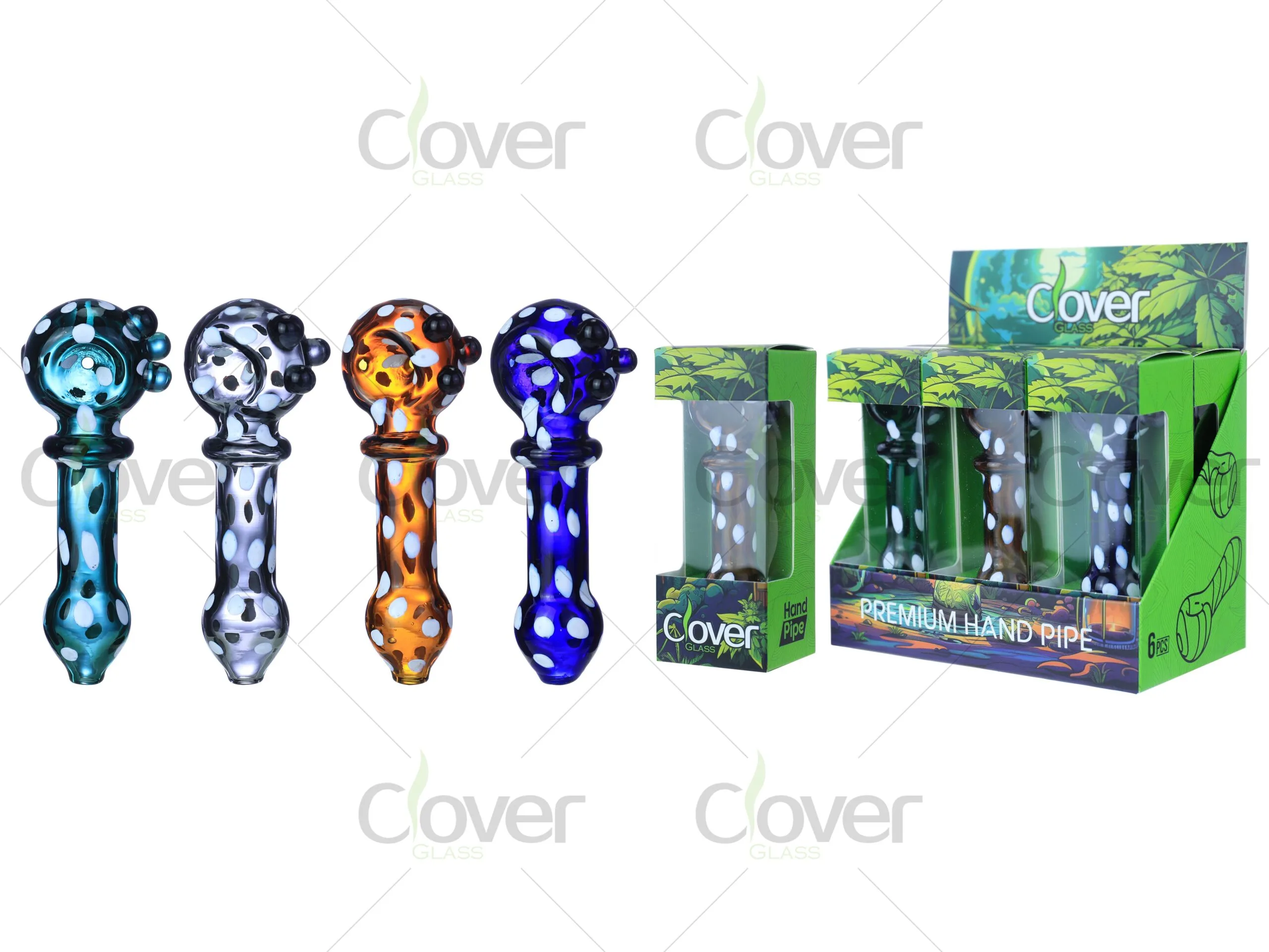 The 4.52 Inch Glass Hand Pipe by Clover Glass features a vibrant colorful dot design that adds a unique touch to its sleek appearance. This hand pipe is made from high-quality glass, offering durability and a smooth smoking experience. The bright dots are incorporated into the design, making each piece visually appealing and functional. The 4.52-inch size is perfect for those who prefer a medium-sized pipe that provides ample space for smoking but is still portable.