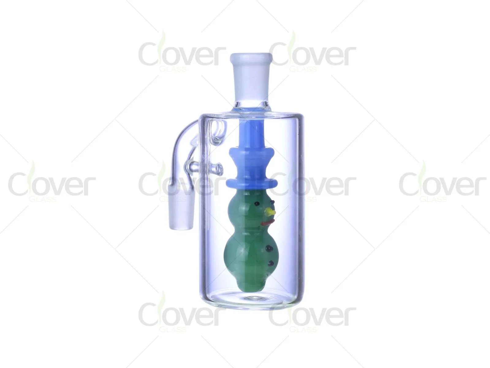 Inside the chamber, a detailed snowman-shaped percolator is vertically mounted and fully enclosed within the clear glass body. This internal structure functions as a fixed diffusion element, allowing smoke to pass smoothly while capturing ash and fine particles before they reach the main bong. The snowman perc also adds a playful visual element while maintaining practical filtration performance.