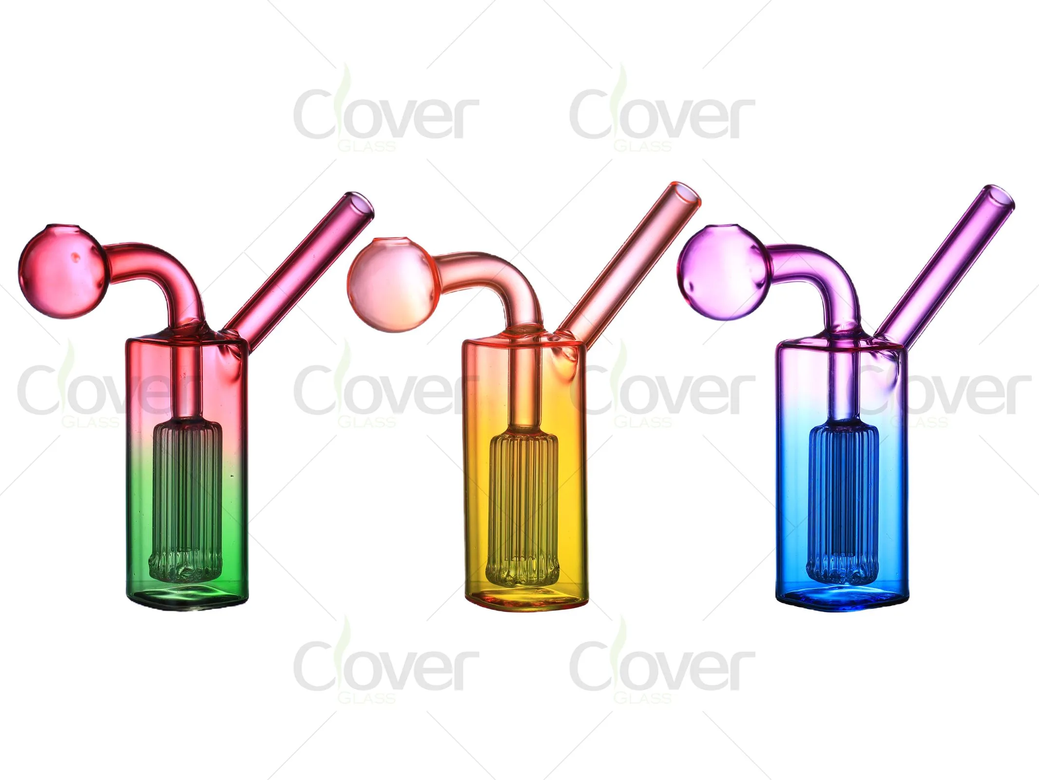 Its standout feature is the built-in percolator for advanced filtration and cooling, ensuring smoother hits with every use. The sleek cylindrical design is paired with vibrant color gradients, including red-green, yellow-orange, and purple-blue, adding a touch of style to this practical piece. Ideal for personal use or retail displays, this oil burner is a must-have for any collection.