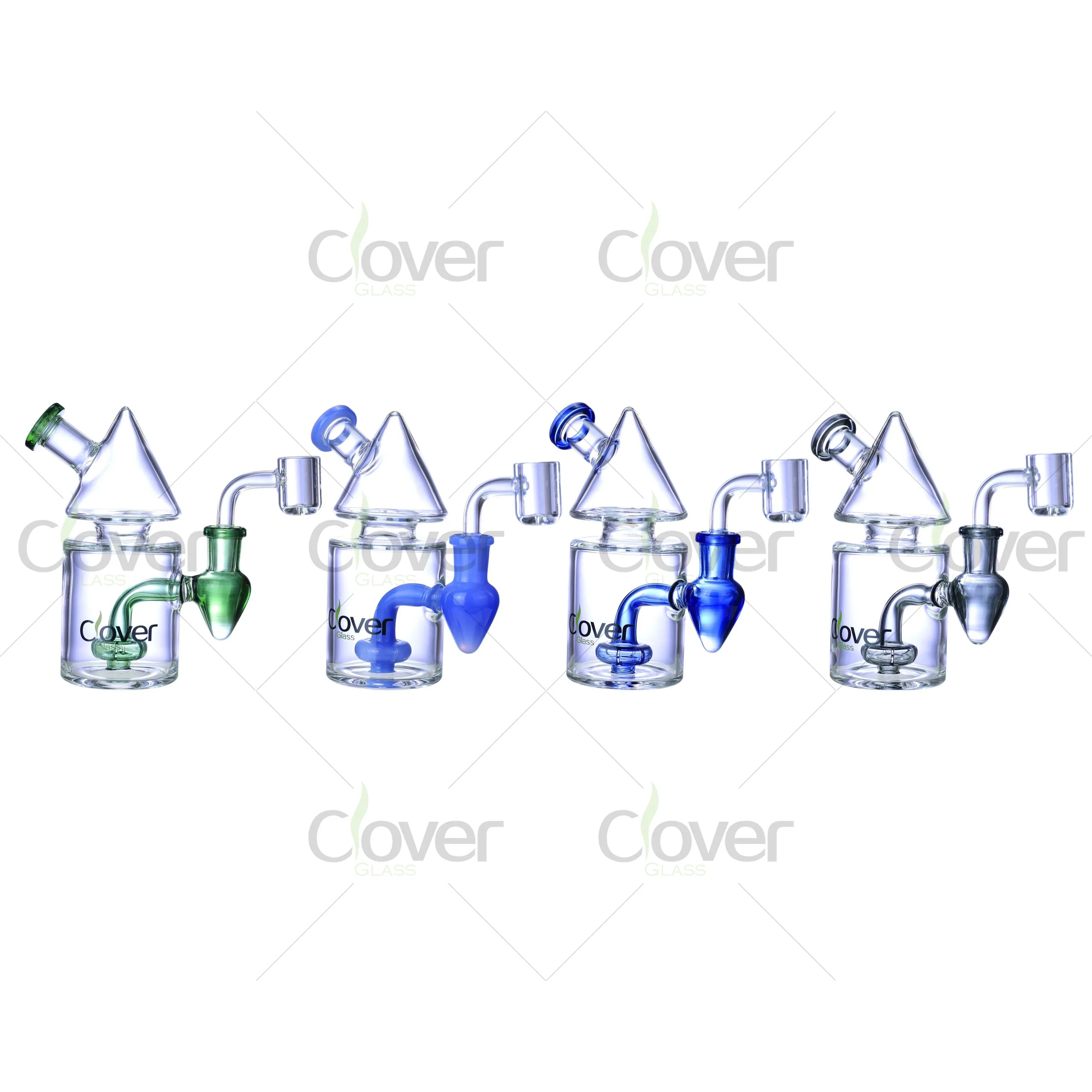 Available in four vivid color combinations — Green, Light Blue, Cobalt Blue, and Smoky Grey — each rig comes complete with a matching quartz banger and angled neck for comfort.