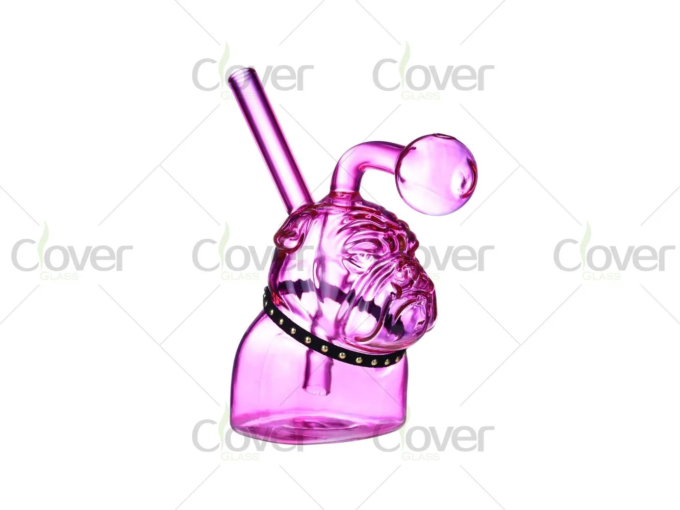This oil burner pipe features a detailed French bulldog–shaped glass body, combining a playful animal design with a compact and functional structure. The sculpted dog head and facial details give the piece strong visual character, while the rounded lower chamber provides a stable base when placed on flat surfaces.