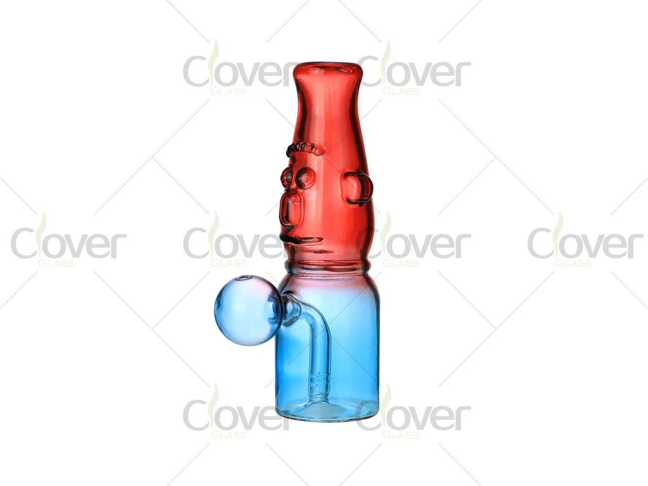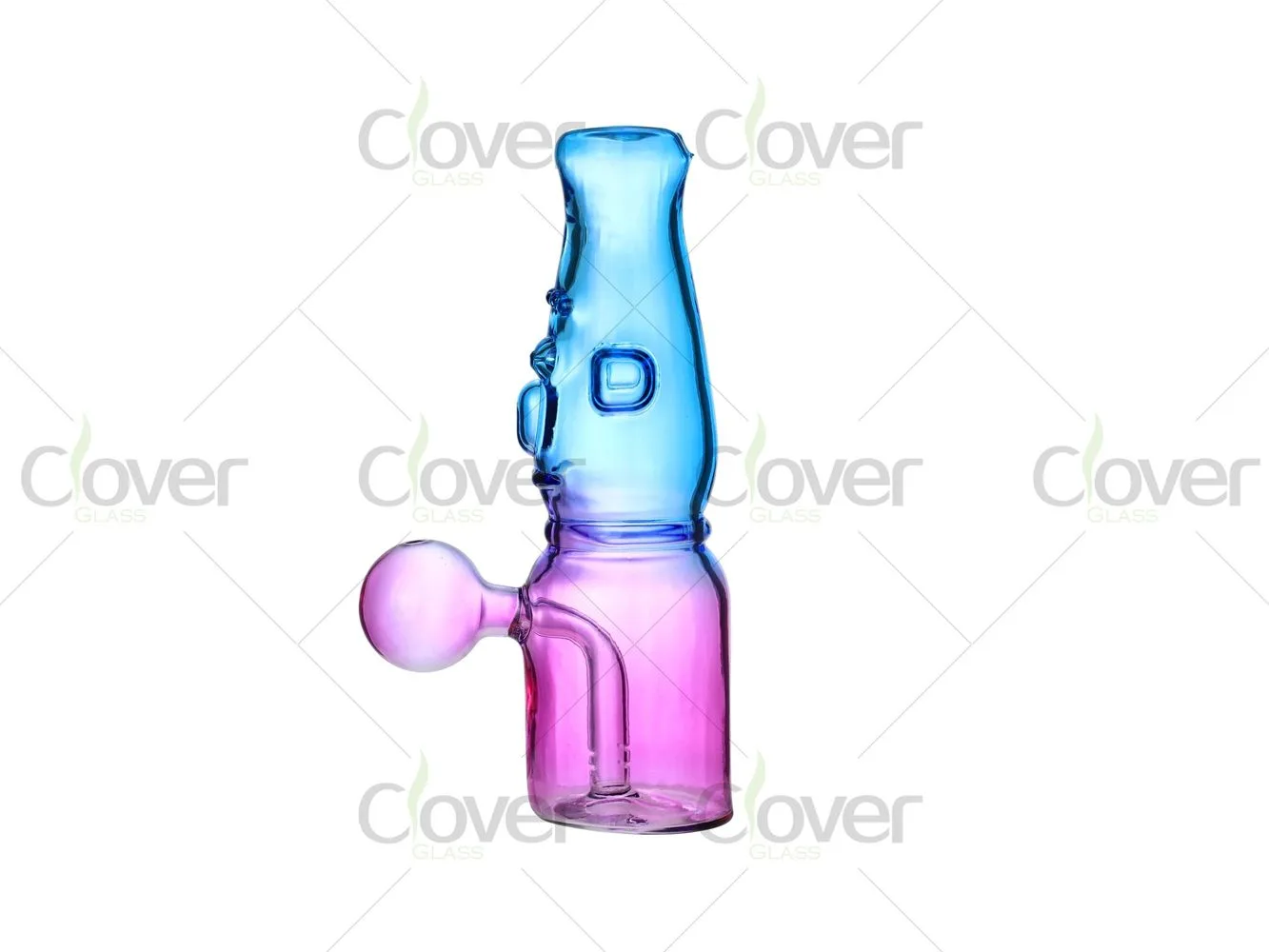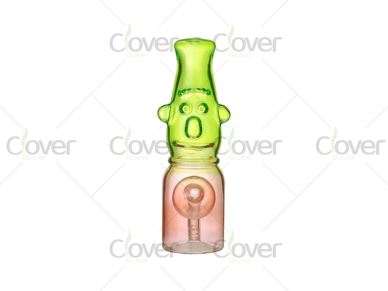 This oil burner pipe features a tall, stylized face-shaped glass body paired with a rounded base chamber, delivering a playful look with functional structure. The elongated upper section showcases molded facial details, adding visual character while providing a comfortable grip during use.