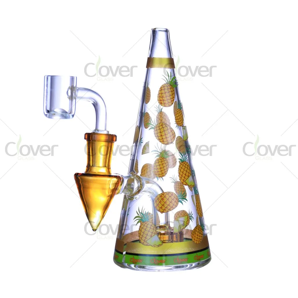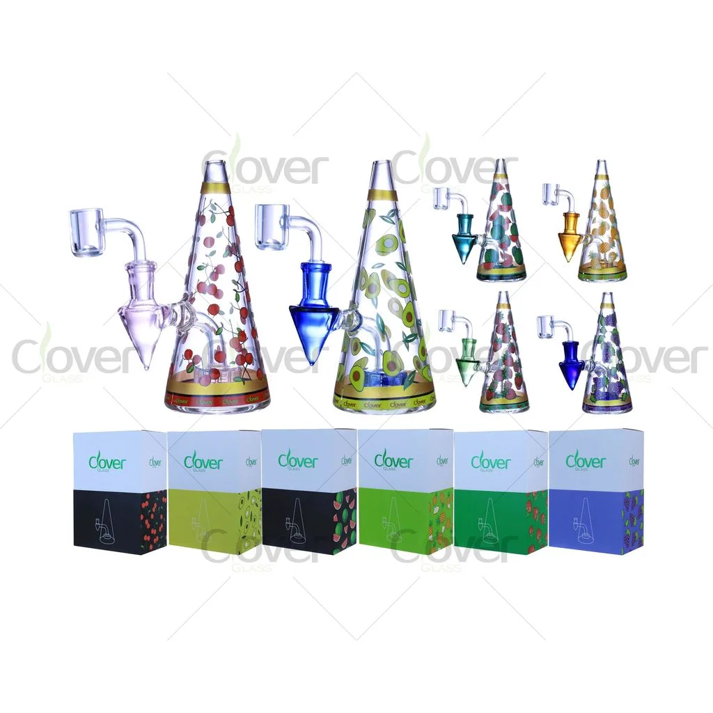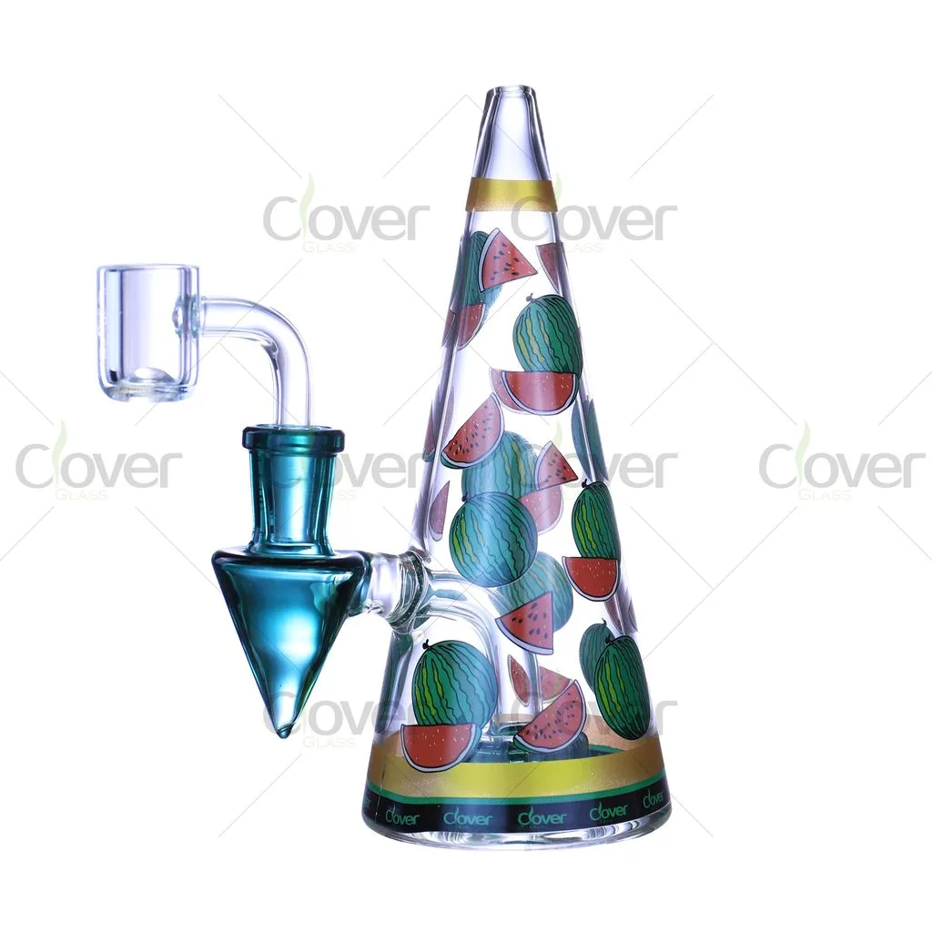 This 6.5-inch cone-shaped glass water pipe features playful fruit-inspired patterns combined with a clean, modern silhouette. The tapered cone body offers a comfortable grip and a stable base, while the colorful fruit graphics add strong visual appeal for retail displays.