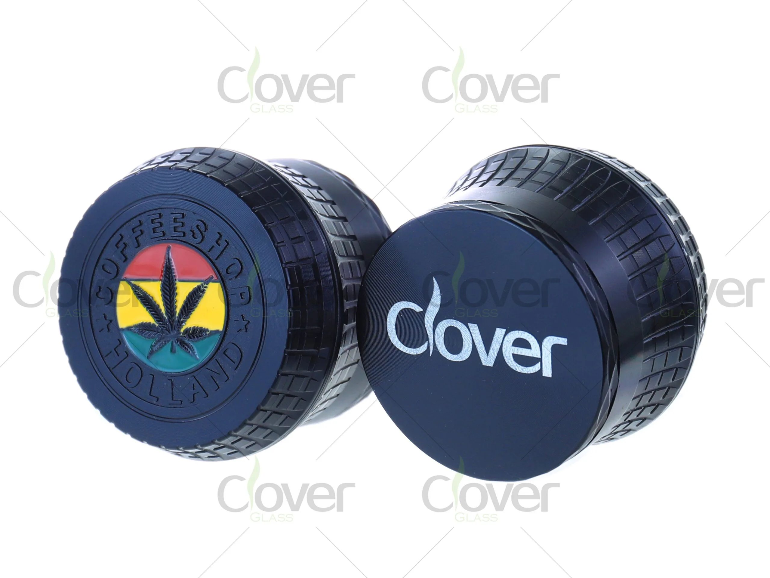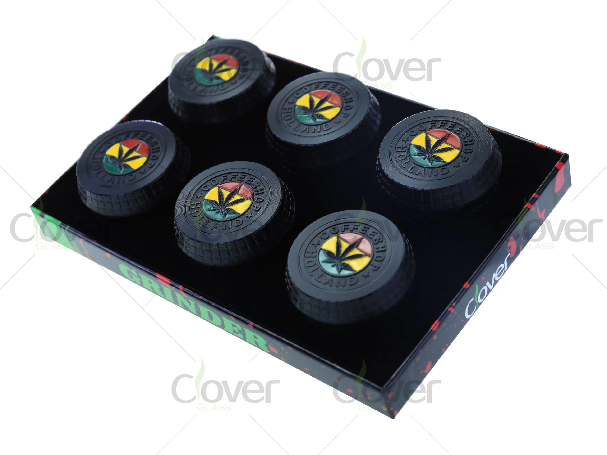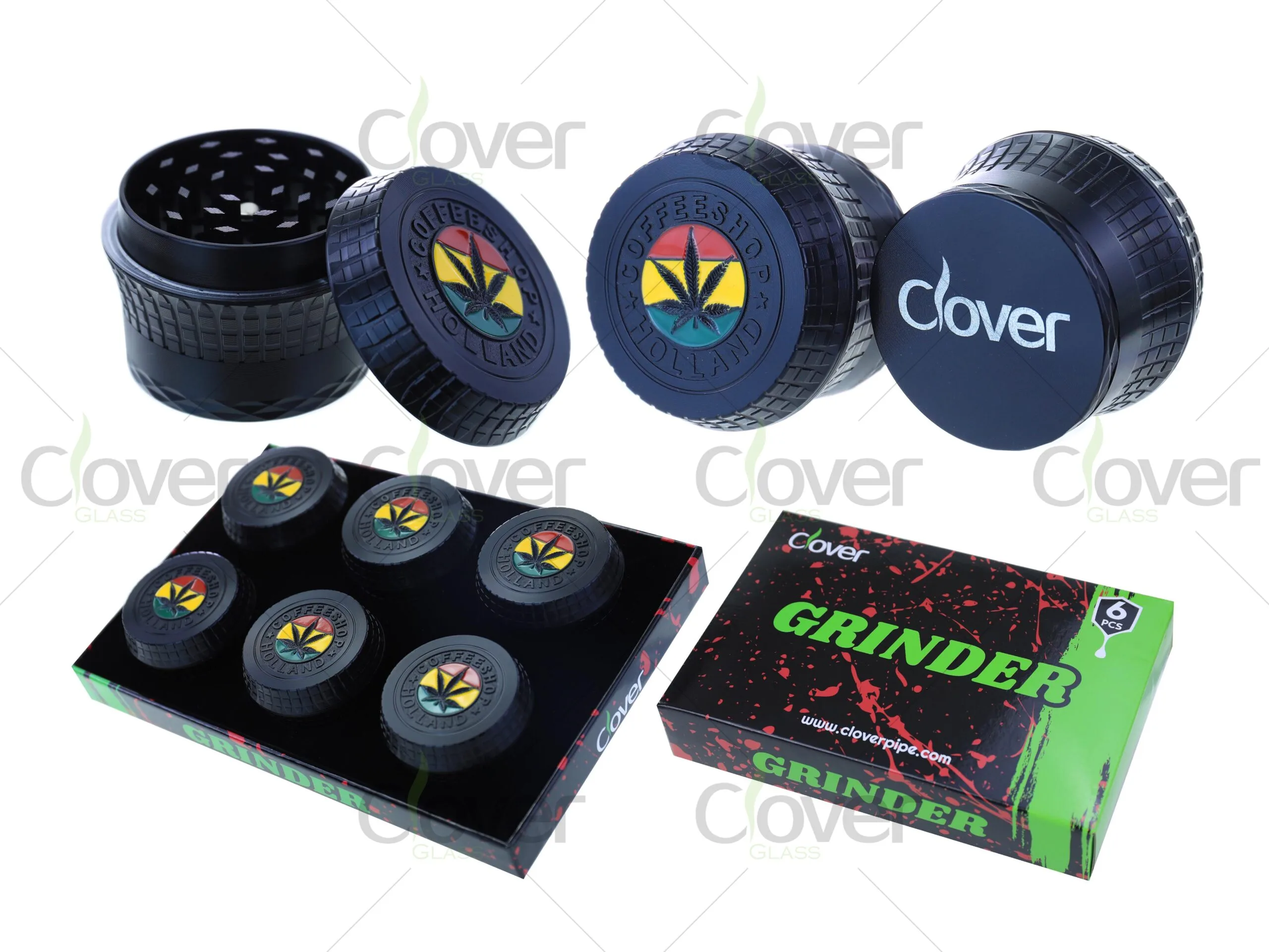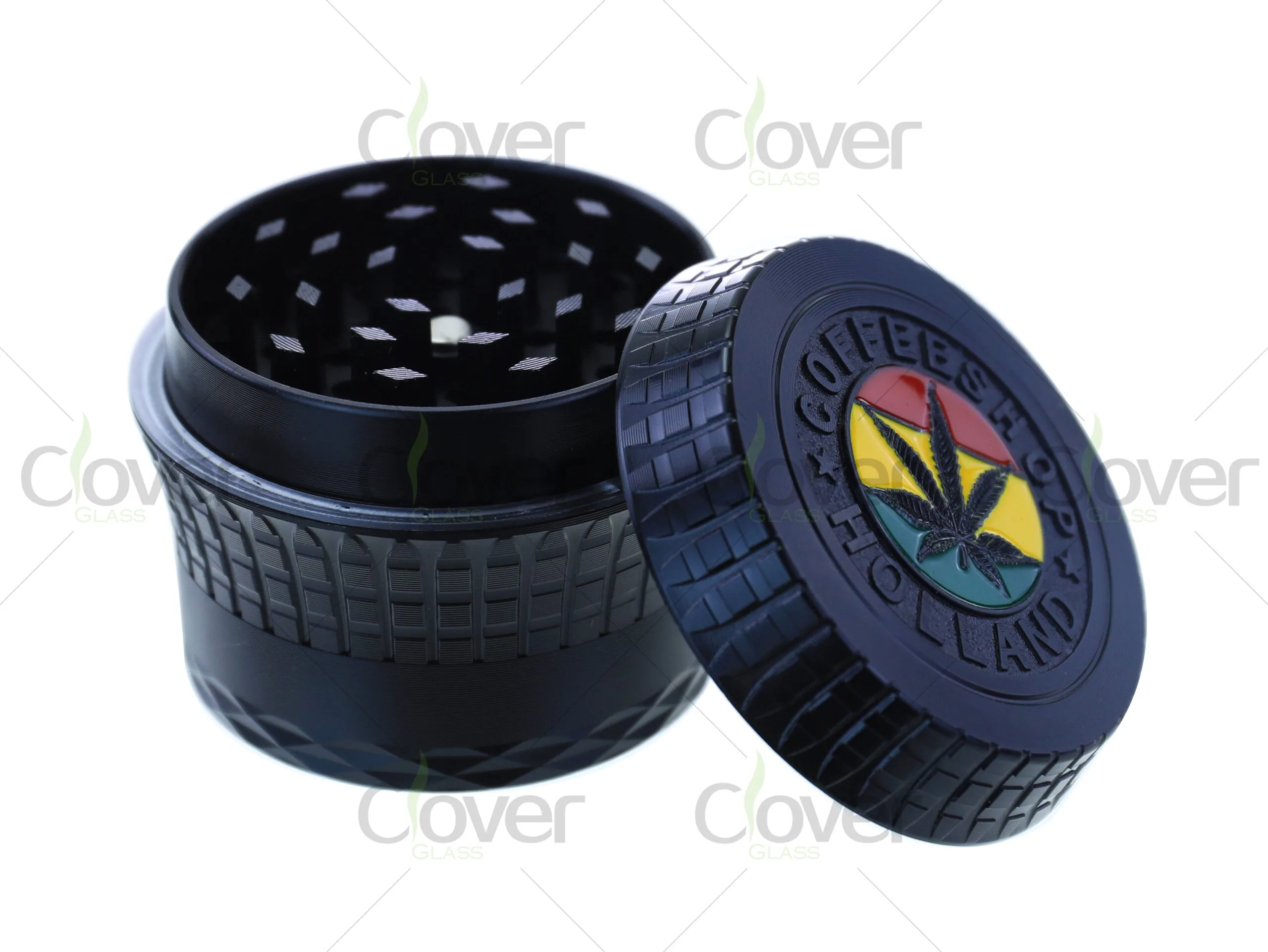 Upgrade your grinding collection with this 58mm aluminum alloy grinder, designed with a realistic tire tread texture for a firm grip and a unique look. Featuring a 4-part grinding system, this grinder is equipped with razor-sharp teeth for a smooth grind, a magnetic lid for secure closure, and a fine mesh screen for pollen collection. The top displays a colorful cannabis leaf emblem, adding a bold touch to its design. Each set includes six grinders in a display box, making it a great option for wholesalers and retailers.
