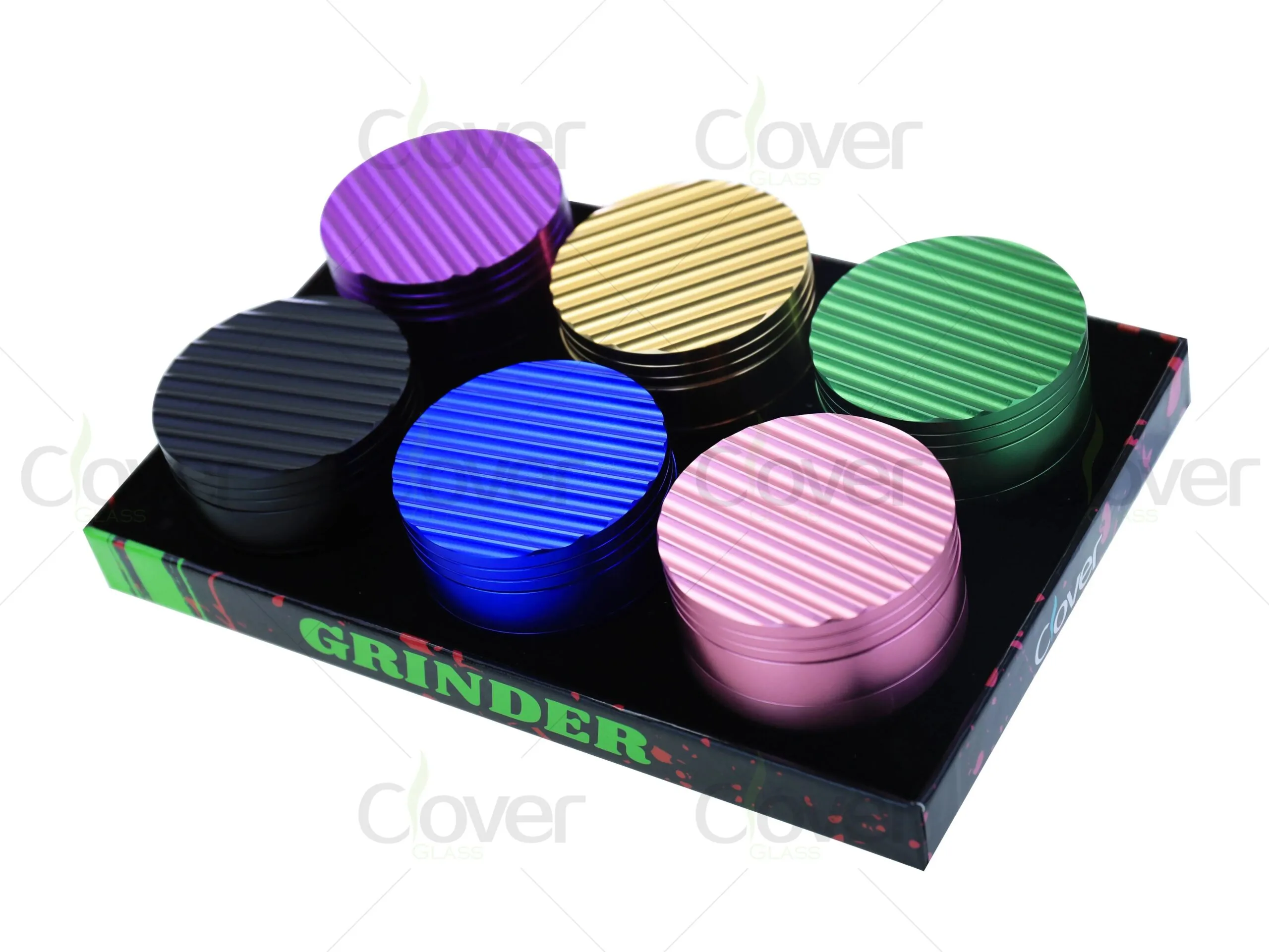 This 6-piece aluminum alloy grinder set features a unique ribbed design in vibrant colors, including purple, gold, black, blue, green, and pink. Made from high-quality aluminum alloy, these grinders are built for durability and long-lasting performance. Each grinder measures 63mm x 43mm and includes a 4-part design for efficient grinding, collection, and storage.