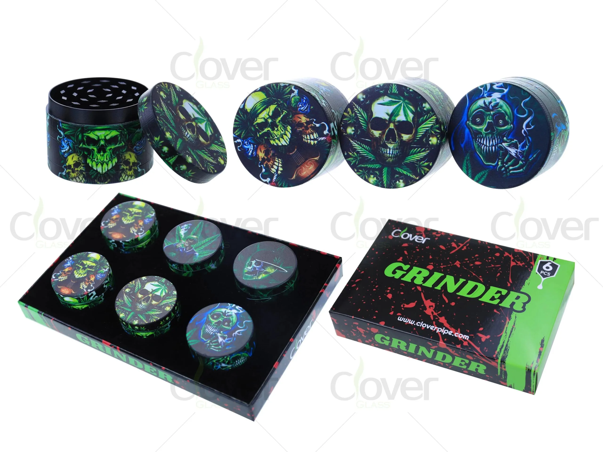 This 6-piece aluminum alloy grinder set is a must-have for any smoke shop or wholesale distributor looking for unique and functional products. Featuring vibrant skull and cannabis-themed artwork, these grinders offer both style and performance. The high-quality aluminum alloy ensures long-lasting durability, while the intricate designs make them a standout item for your customers.