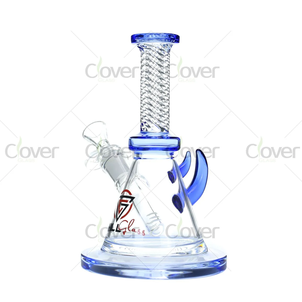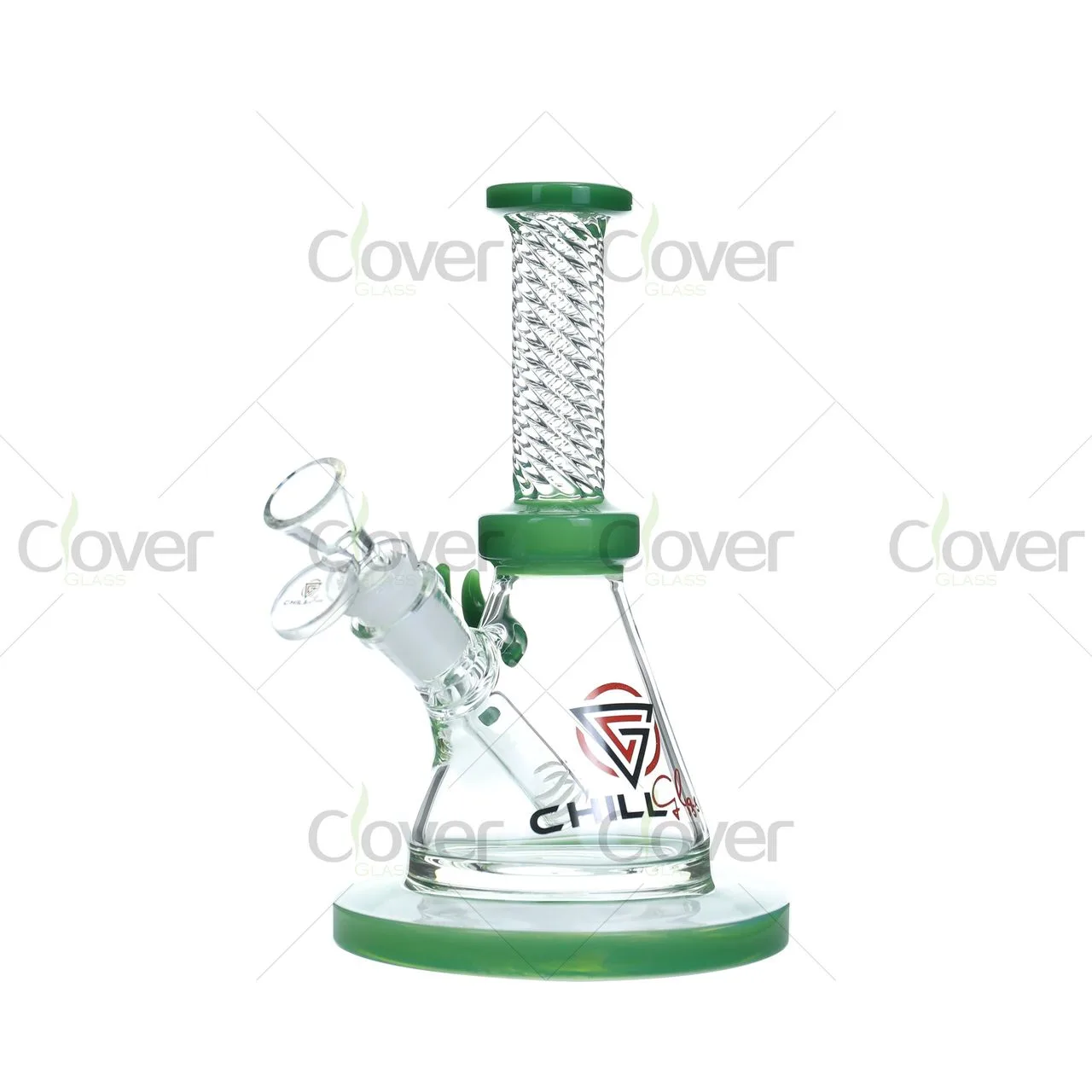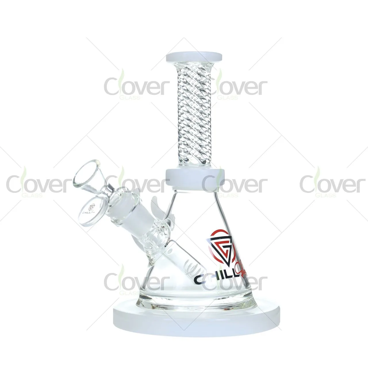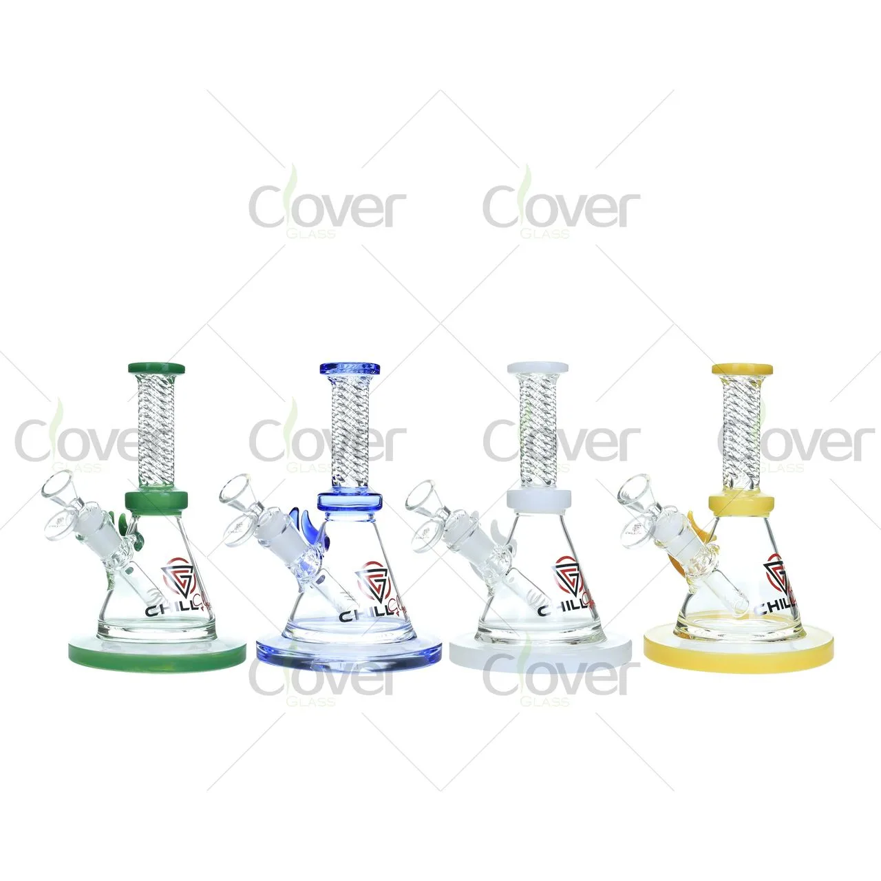 This 8-inch beaker-style bong combines compact functionality with a unique spiral neck design, offering both aesthetic appeal and extra cooling for a smoother experience. The piece is crafted from durable 5mm thick borosilicate glass, with a color-matching base and mouthpiece to add a clean, modern touch to any shelf or online listing.