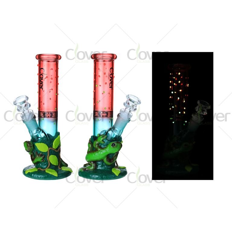 Bring nature to your smoke session with this 9.05-inch frog-themed glass bong, designed with vibrant jungle details and a playful forest frog wrapping around the base. The body features a red-to-teal gradient tube with embedded dot accents that glow in the dark, creating a stunning effect under low light or blacklight.