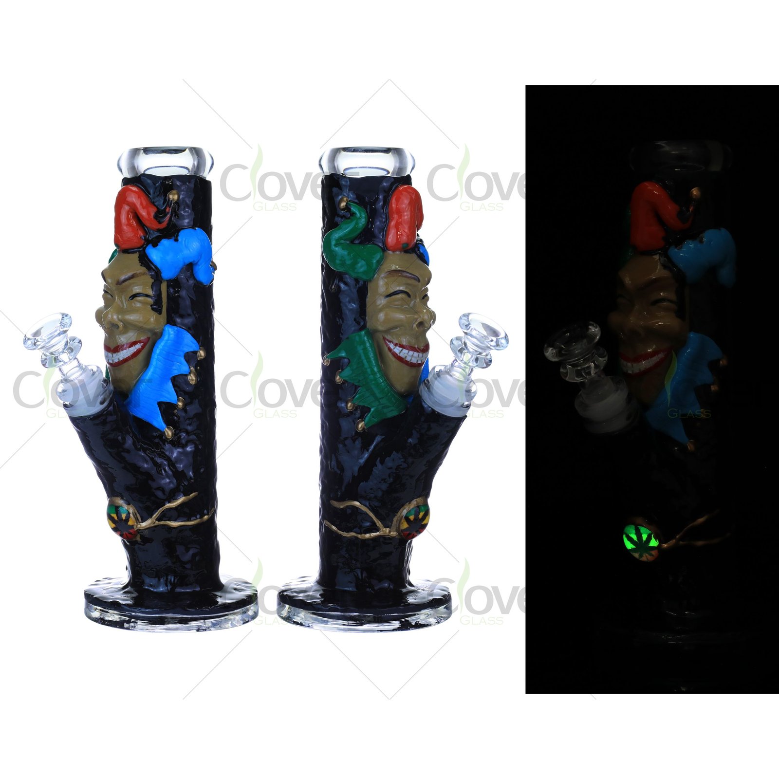 Bring personality and fun to your collection with this Joker Face Glow in the Dark Glass Bong. Standing 9.05 inches tall with a durable 5mm thick glass body, this bong is designed with a striking 3D-printed Joker character that lights up under dark conditions for an unforgettable smoking experience.