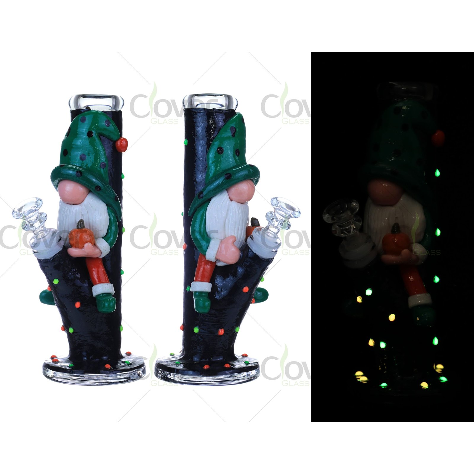 Bring a touch of fun and holiday charm to your smoke sessions with this 3D printed bong featuring a whimsical Santa gnome design. Standing at 9.05 inches tall and crafted from durable 5mm borosilicate glass, this piece blends playfulness with quality. The surface is decorated with a detailed gnome figure, complete with a tall hat and cheerful beard, while the black base is accented with glowing dots that light up in the dark, giving your night sessions an extra vibe.