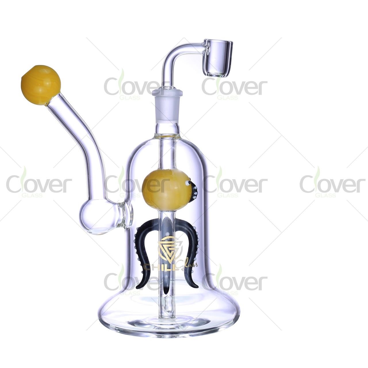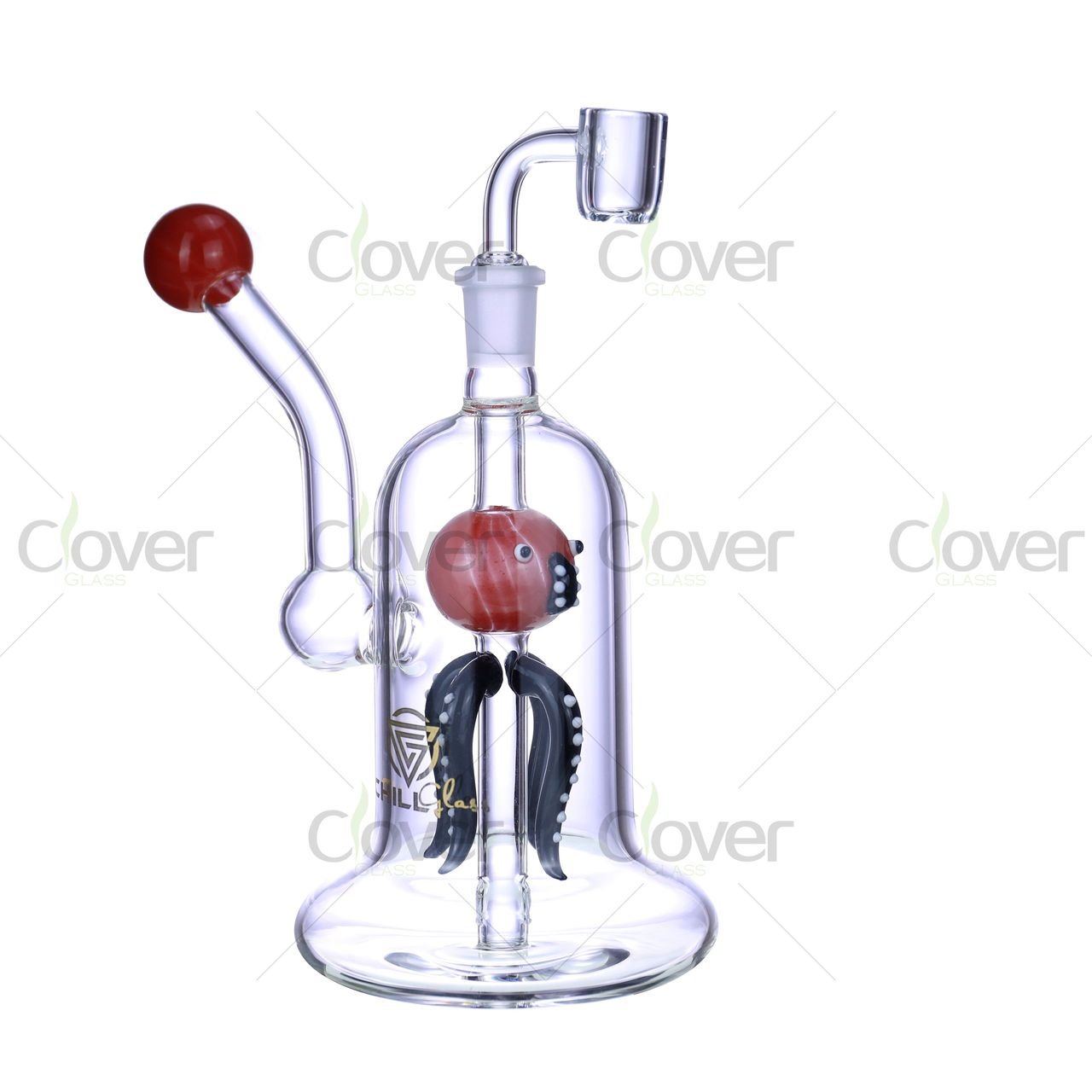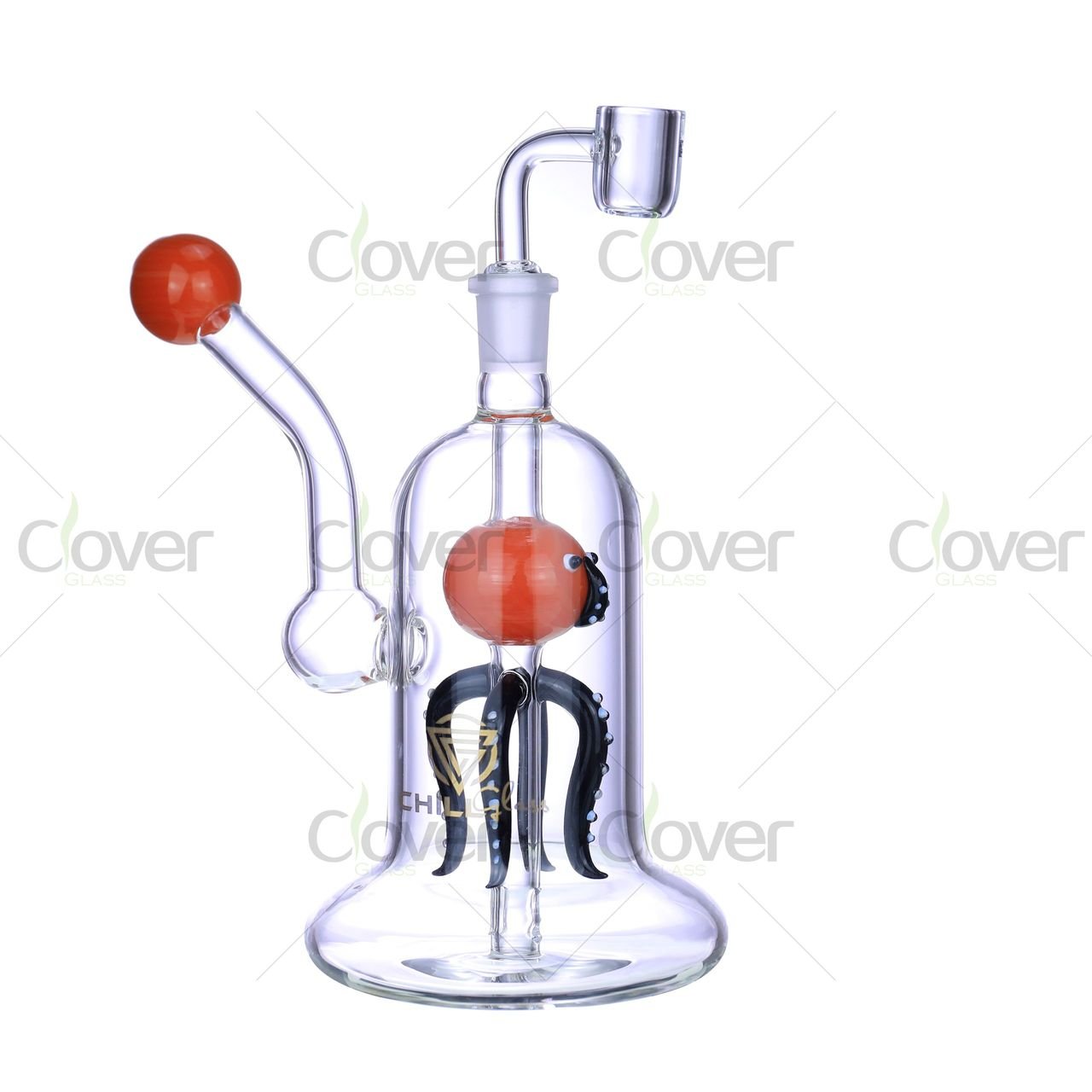 Add a touch of oceanic artistry to your collection with this eye-catching 9.05-inch dab rig, featuring a whimsical handcrafted octopus perc suspended inside the chamber. Crafted from 5mm thick borosilicate glass, this rig ensures durability while delivering an incredibly smooth filtration experience.