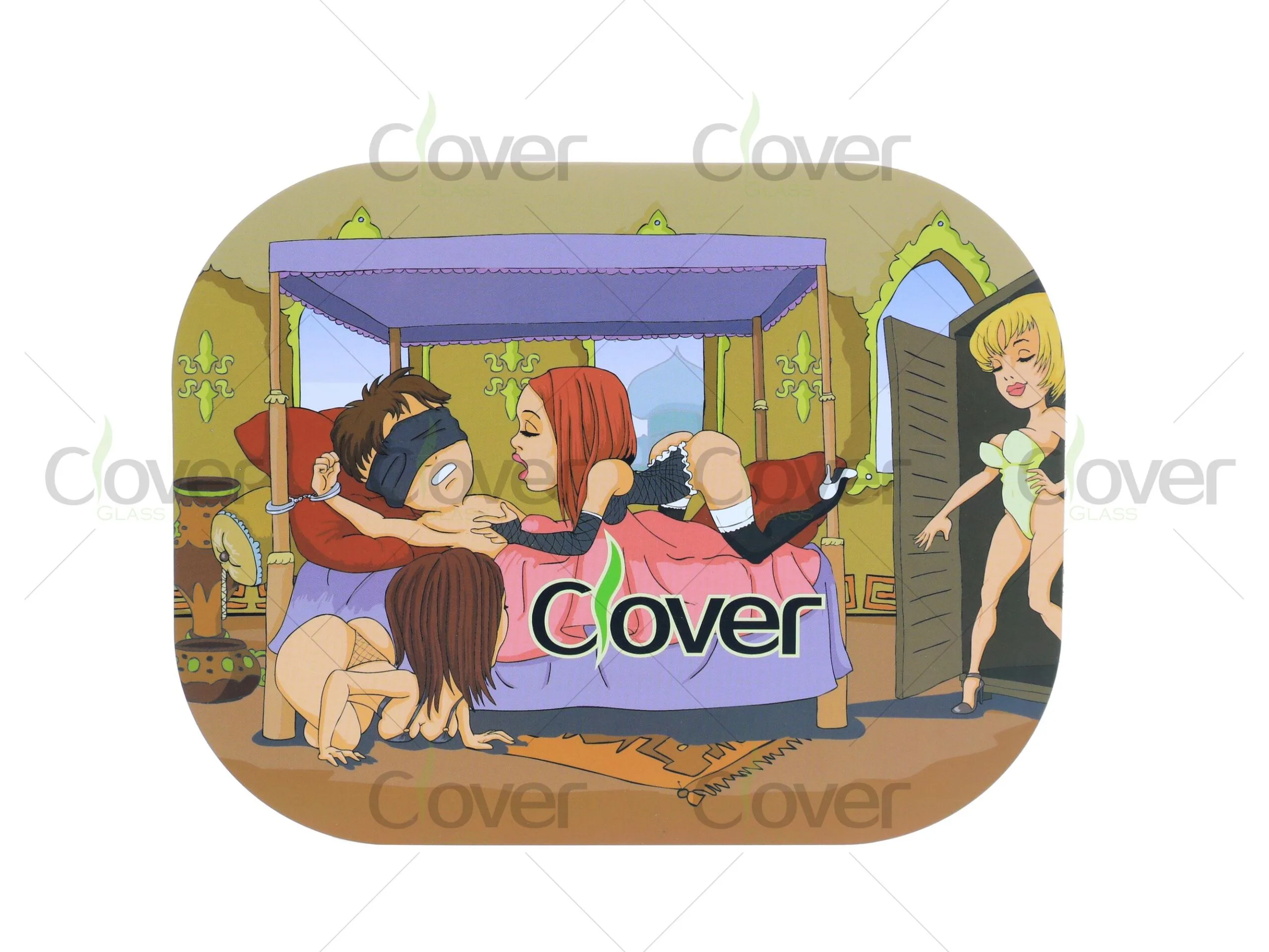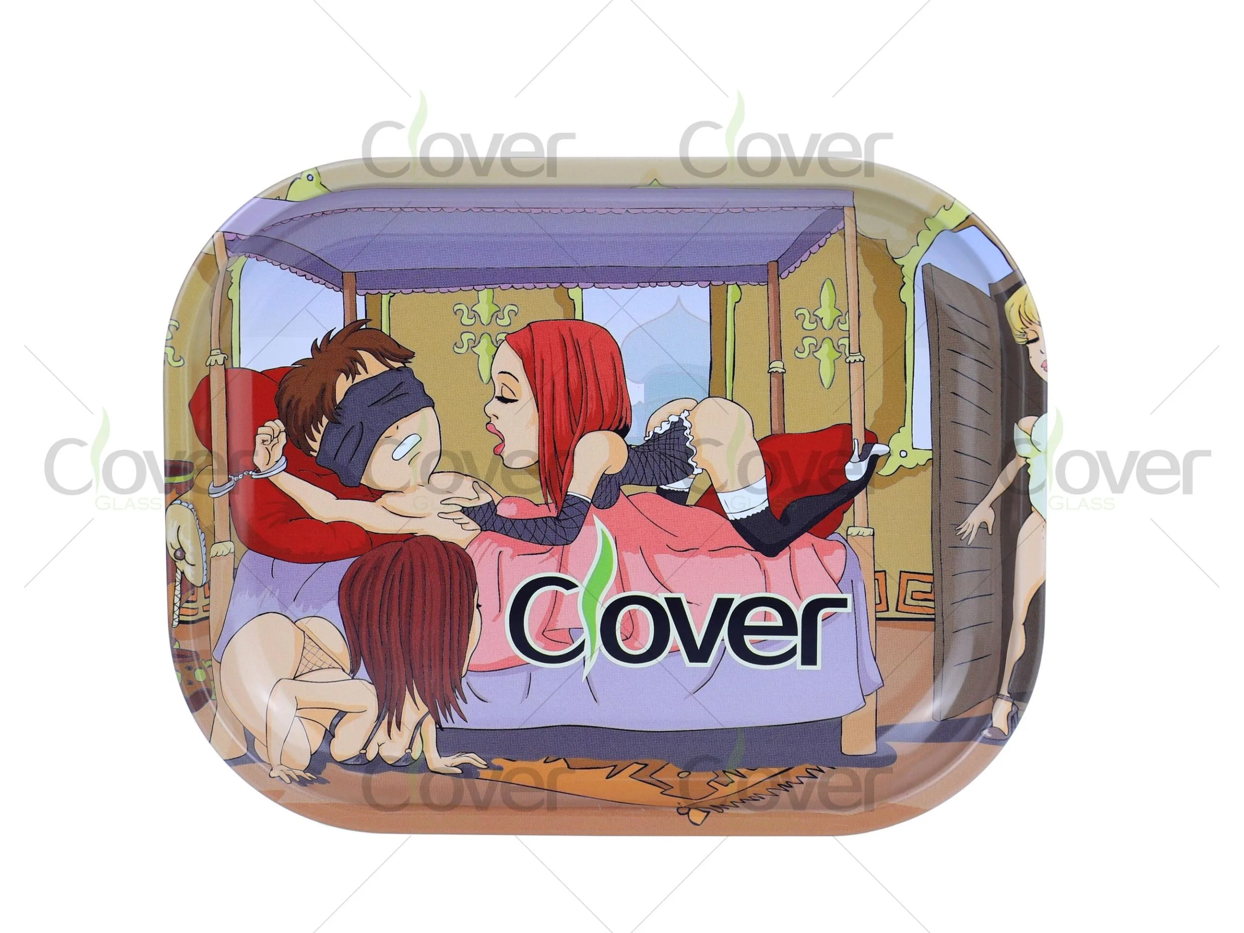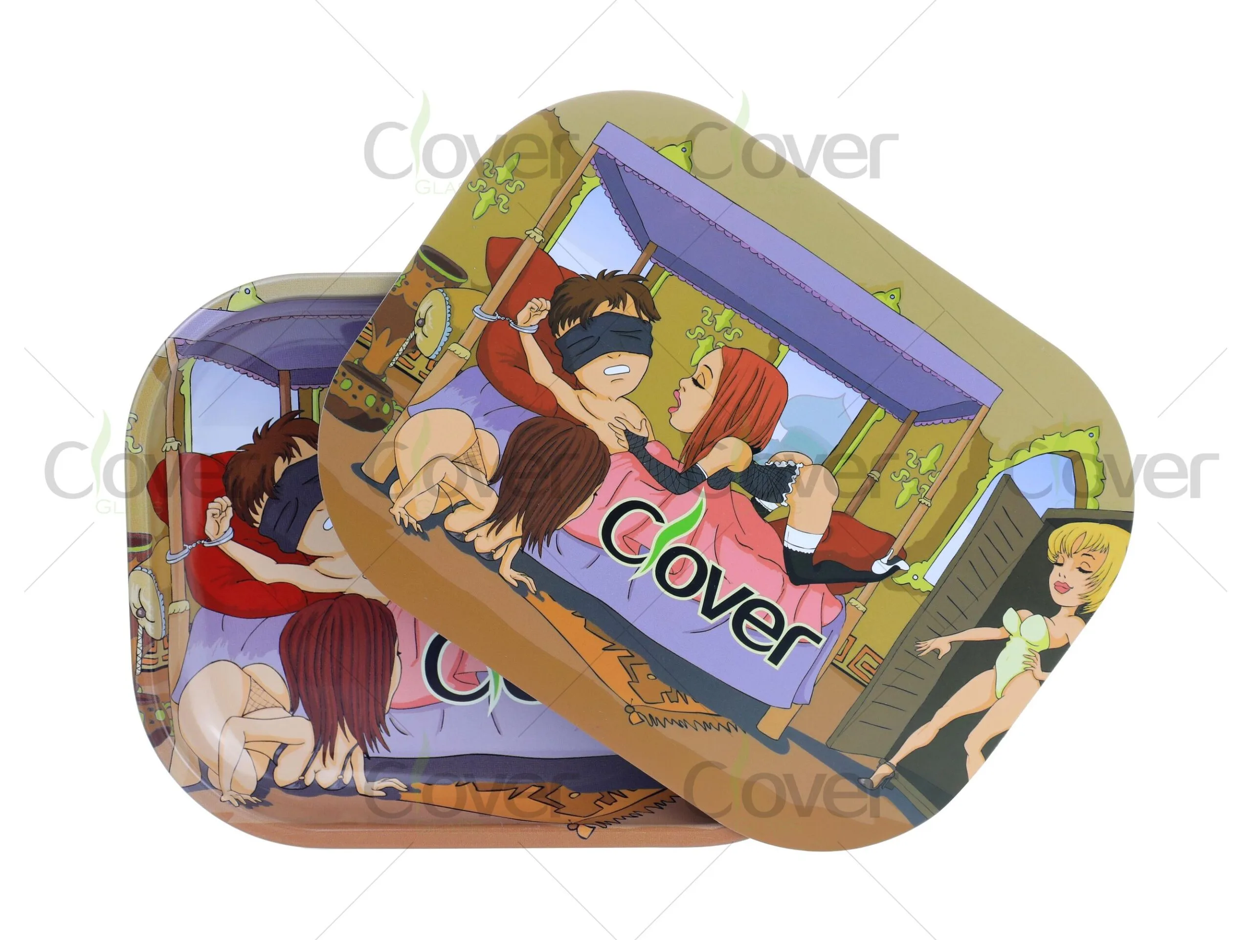 Dare to stand out with the Cartoon Dungeon Rolling Tray Set by Clover Glass — a bold, cheeky design that mixes adult humor with comic-strip art. Featuring a playful cartoon bedroom scene with suggestive character poses, this tray set is made for shops that aren’t afraid to push the boundaries.