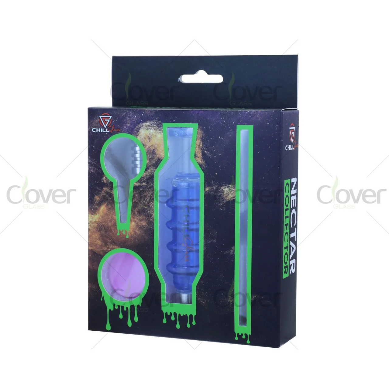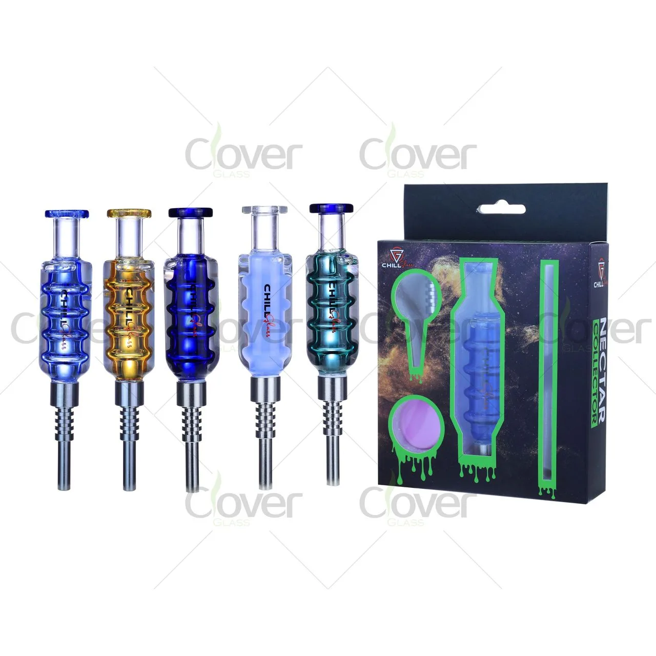 Elevate your dabbing game with the Chill Glass 8" Nectar Collector Kit, a compact and stylish setup built for flavor chasers. This all-in-one set includes 1 nectar collector body, 1 titanium nail, 1 glass straw, and 1 silicone dish, all neatly packed in a premium retail-ready gift box.