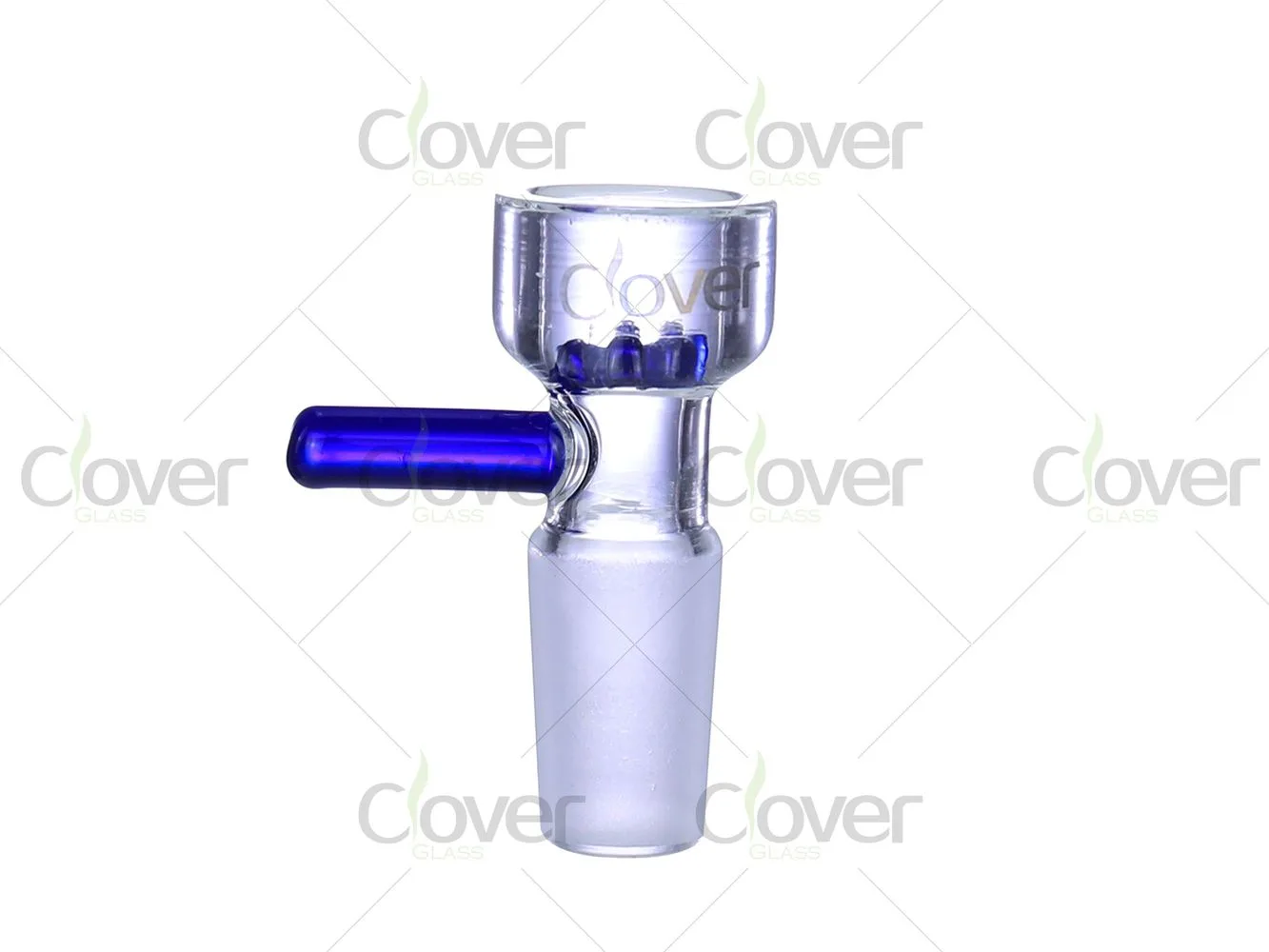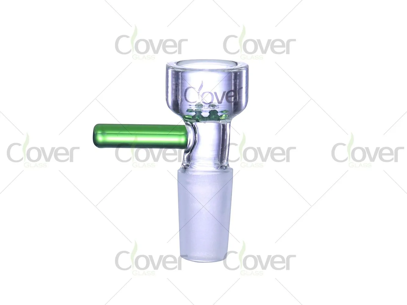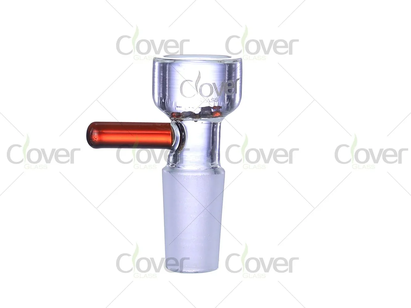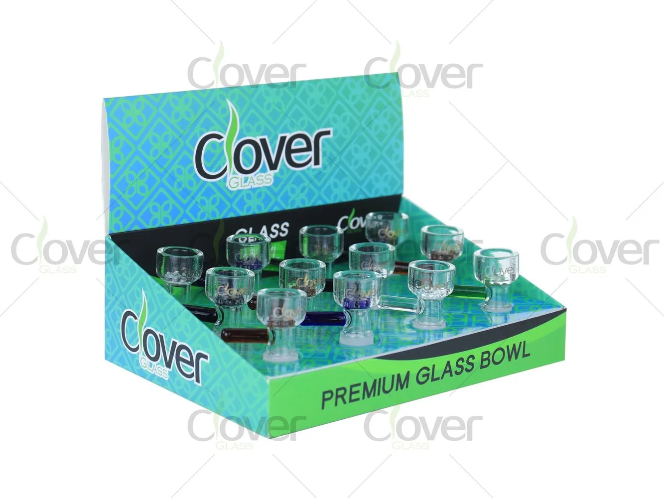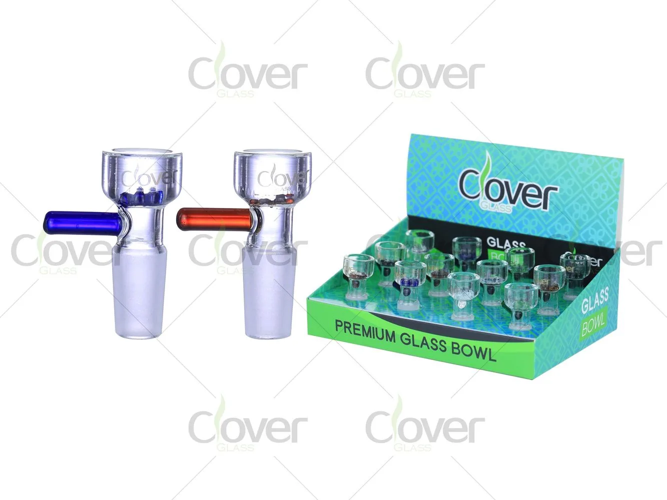 The bowl connects through a standard 14mm frosted joint, compatible with most glass water pipes. All pieces are packed in a Clover Glass branded display box, allowing mixed handle colors within the same display.
