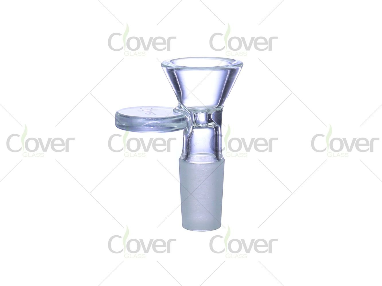 This glass bowl features a two-piece construction, consisting of a clear funnel-shaped bowl and a separate flat glass cap that sits securely on top. The removable cap helps reduce ash and debris while keeping the bowl clean between uses.