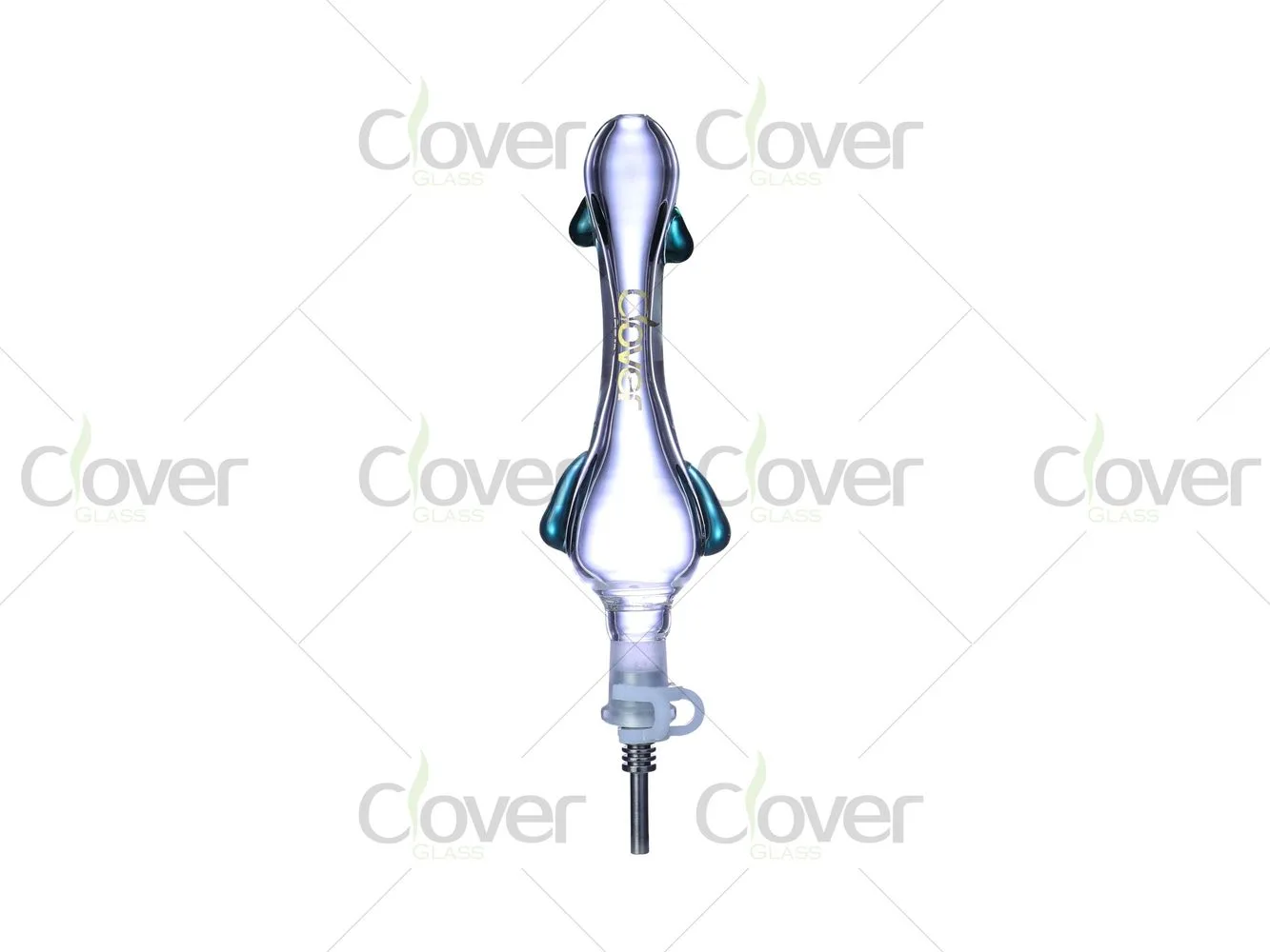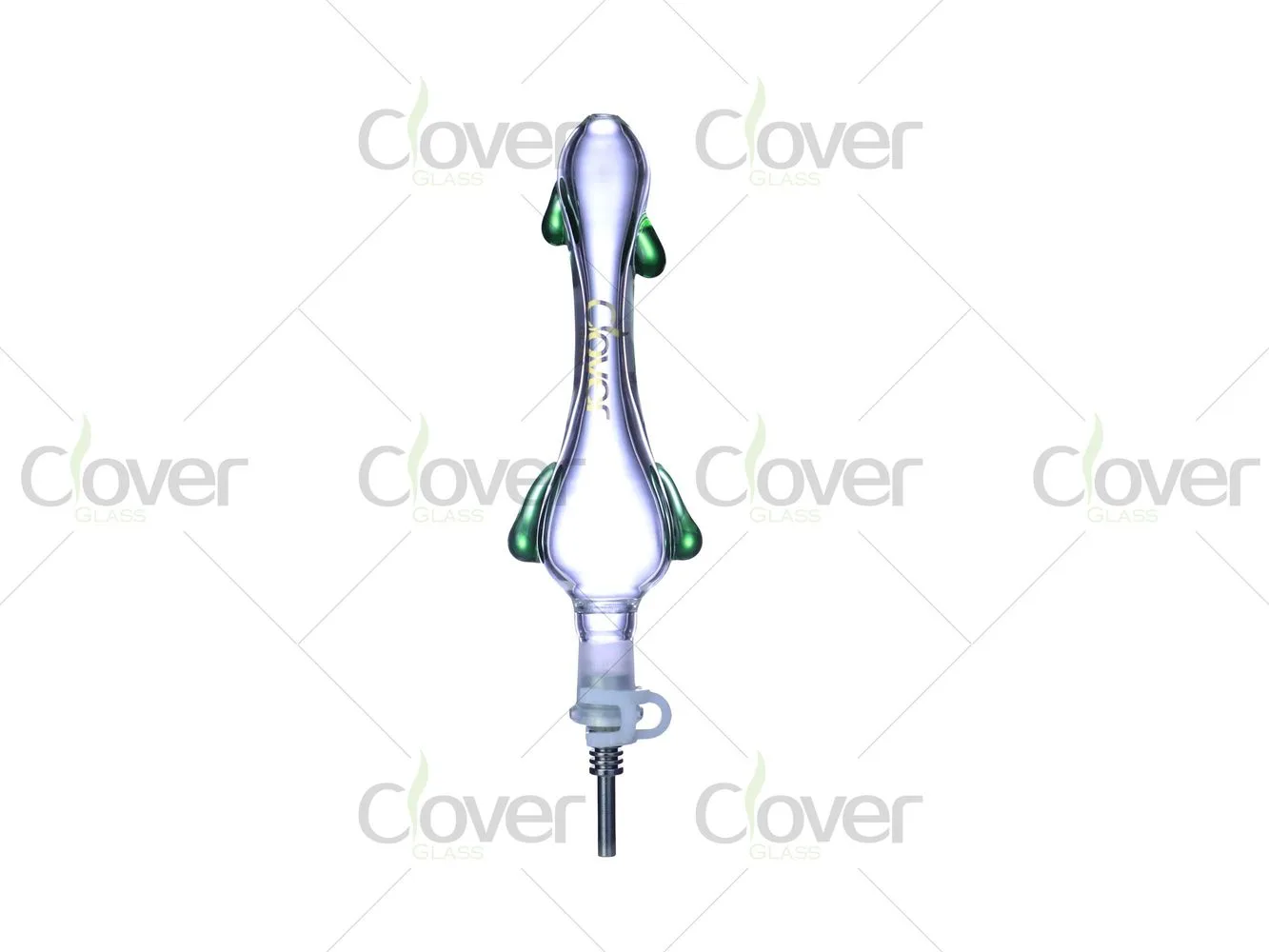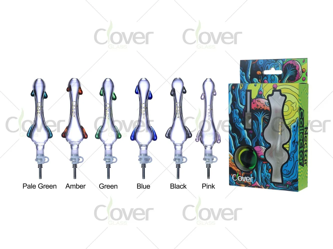 The nectar collector is available in mixed accent colors including pale green, amber, green, blue, black, and pink, making it a great option for assorted retail displays. Each unit is packed in a Clover Glass branded box, ready for shelf presentation or online sales.