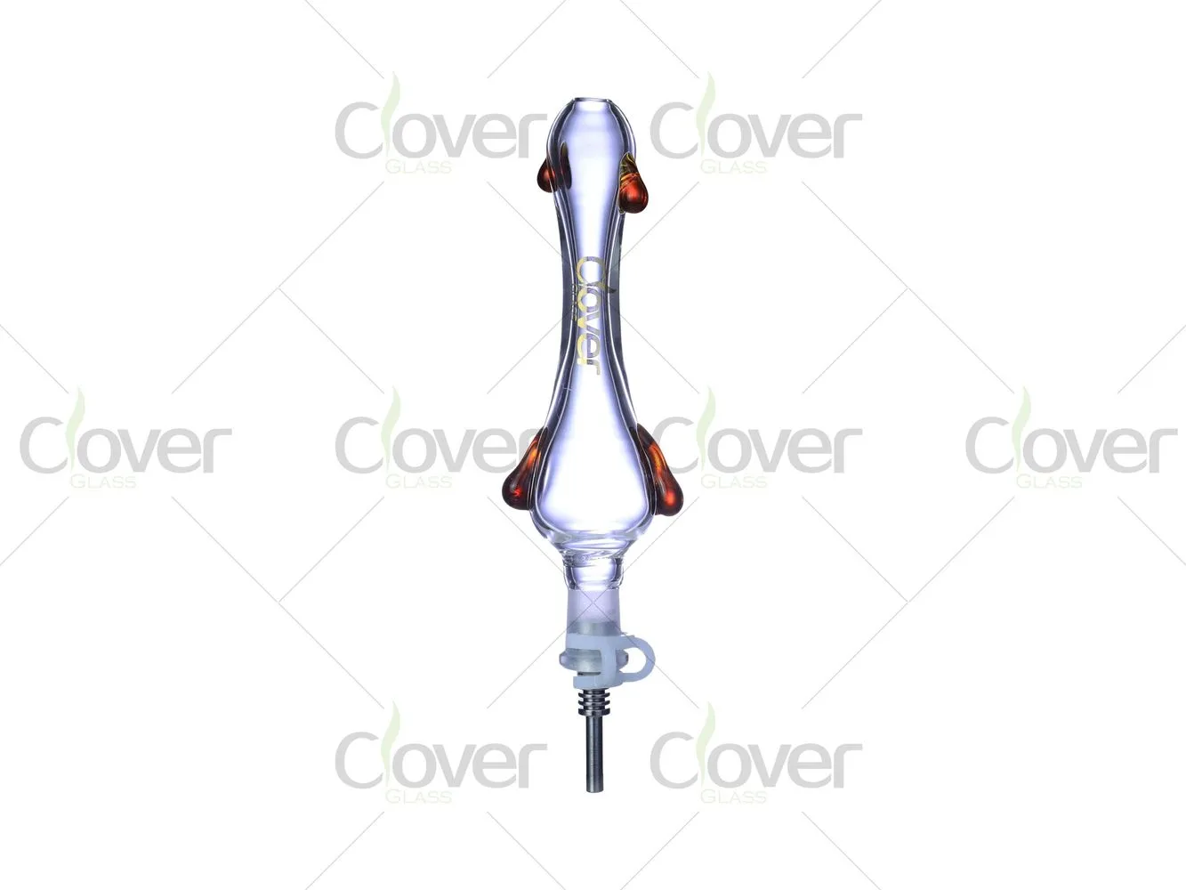 This clear glass nectar collector features a slim, elongated body accented with raised side color details, adding visual interest while keeping a clean and professional look. The ergonomic shape offers a comfortable grip and balanced handling, making it suitable for both casual and experienced concentrate users.