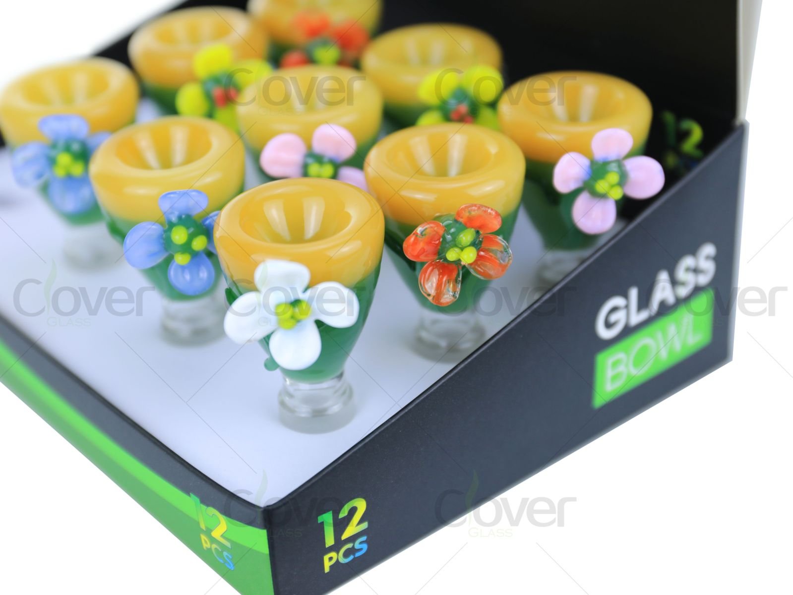 Packed in a countertop display box, this set includes a full assortment of colors, making it ideal for smoke shops looking to add eye-catching glass bowls that stand out immediately at point of sale.