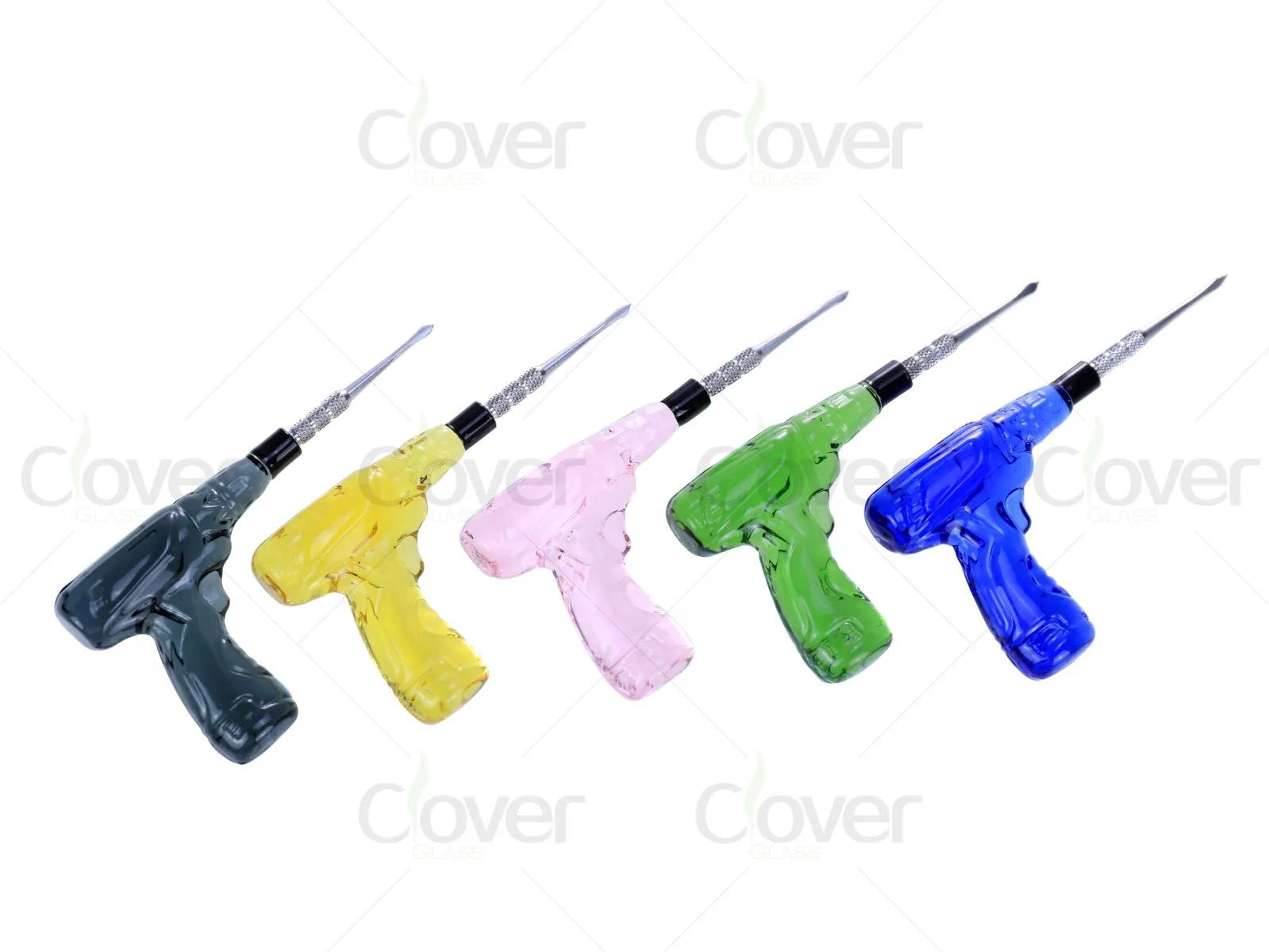 Clover Glass specializes in dab tools that blend distinctive glass shaping with practical usability. This pistol-style dab tool is produced with consistent glass thickness, clean color application, and firmly installed metal tips to ensure stability and long-term use.