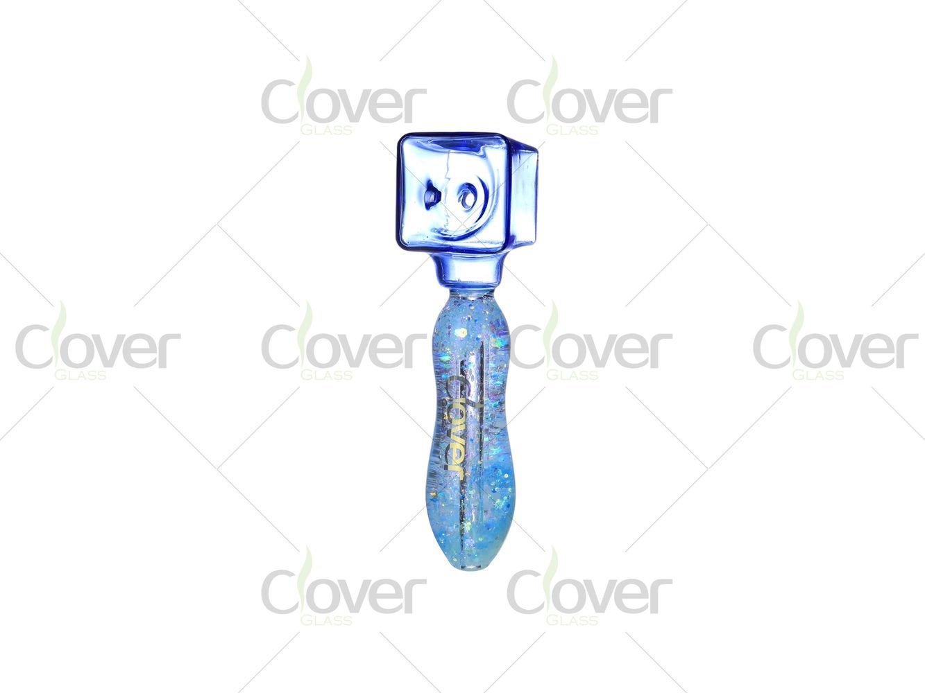 This glass hand pipe features a distinct cube-shaped bowl head, creating a bold, modern silhouette with clean edges and flat surfaces. The squared bowl profile delivers strong visual contrast compared to traditional round or hexagonal designs, making it instantly recognizable on retail shelves.