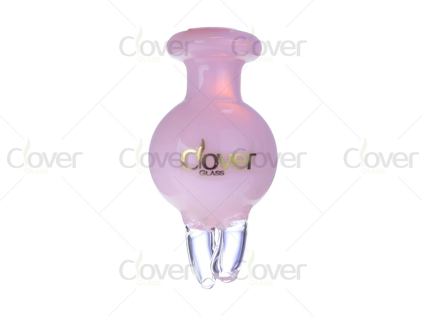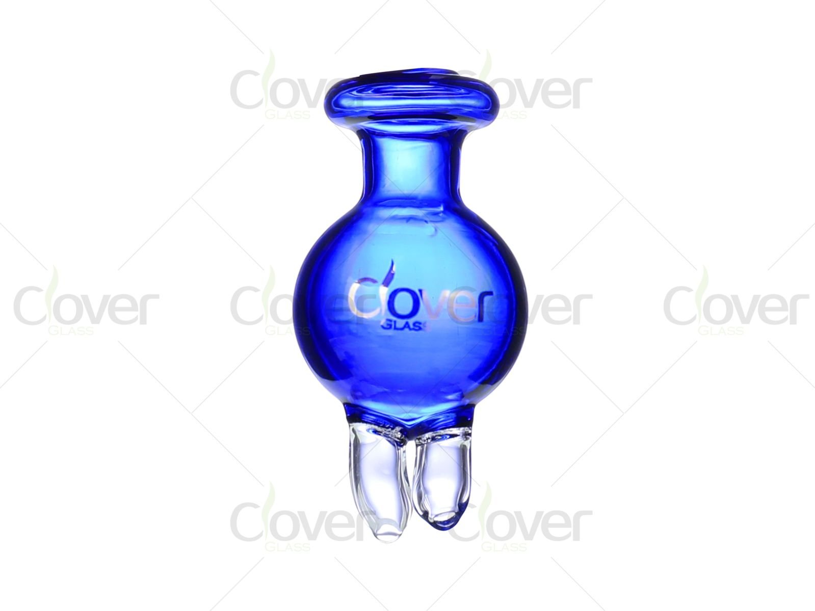 This standing glass carb cap features a round bottle-style body with dual glass feet, allowing it to stand upright on the table when not in use.