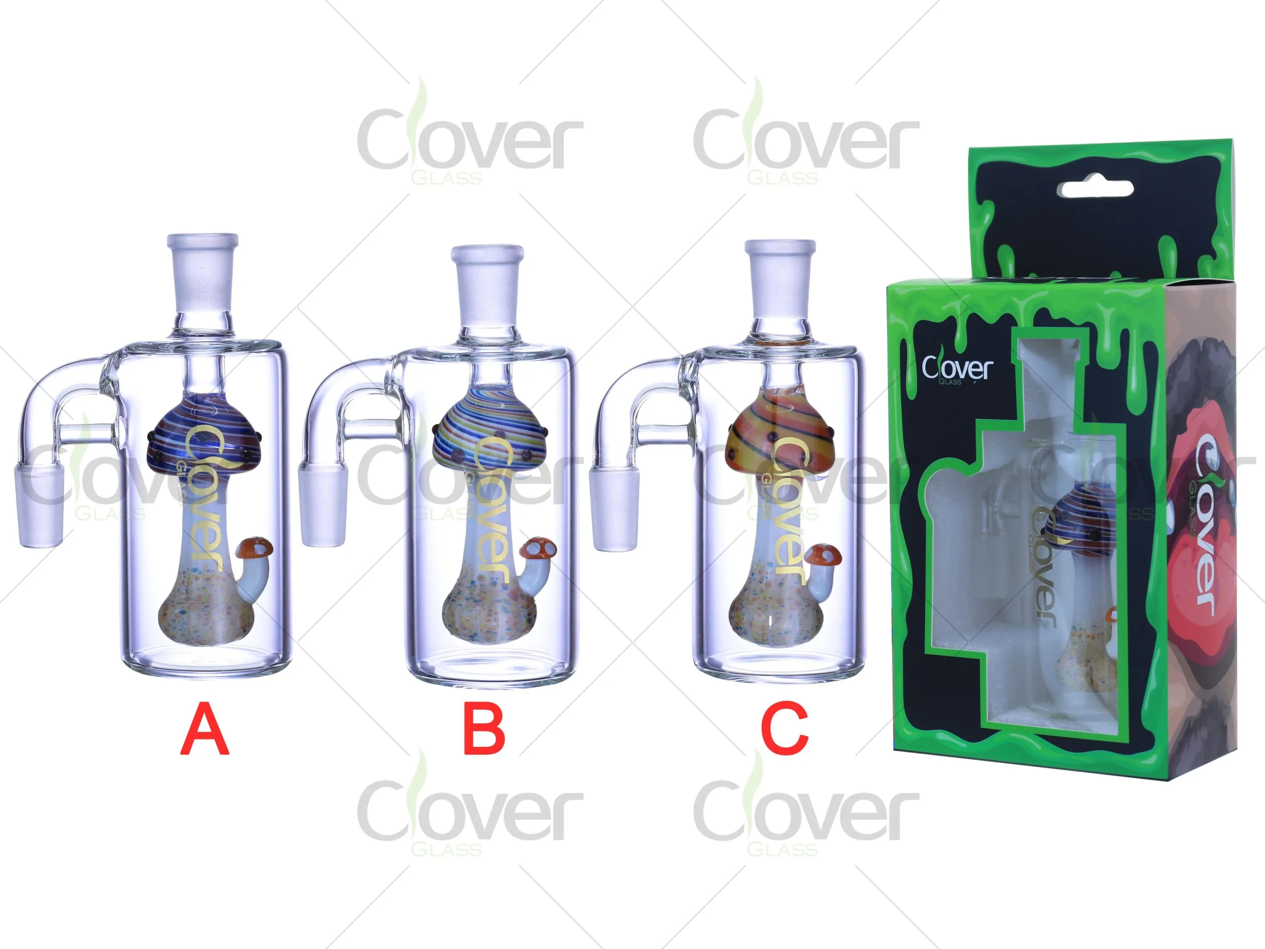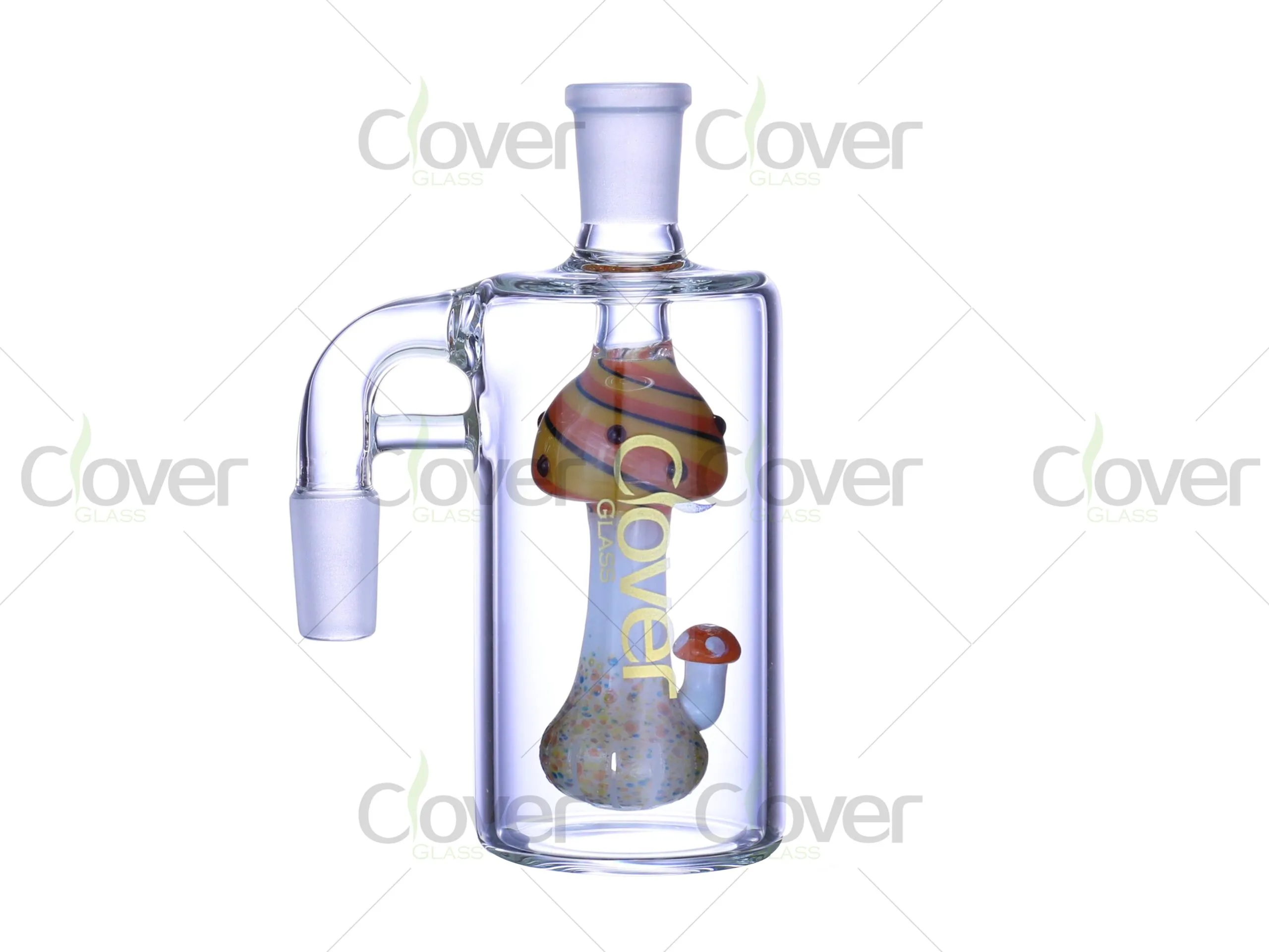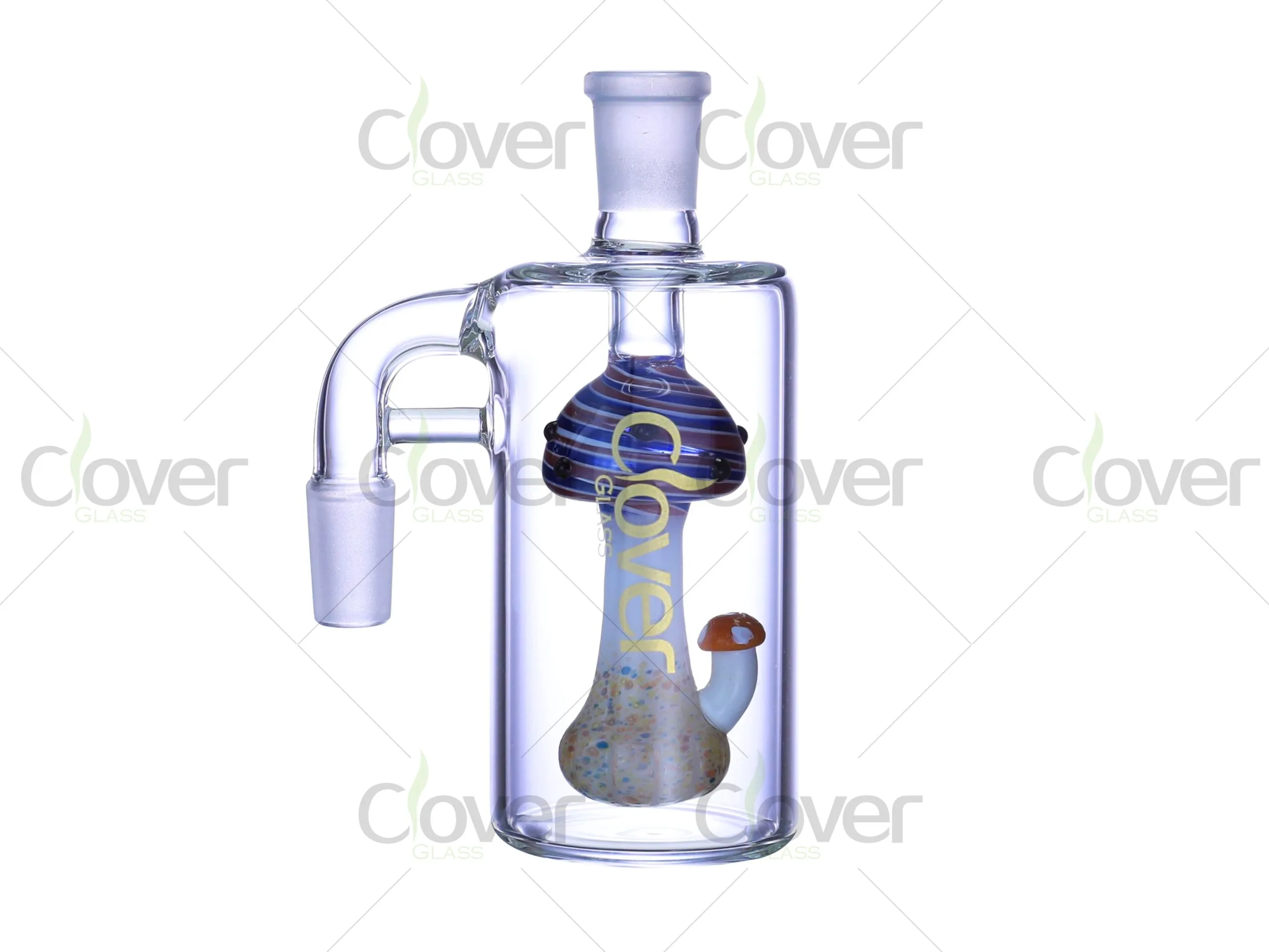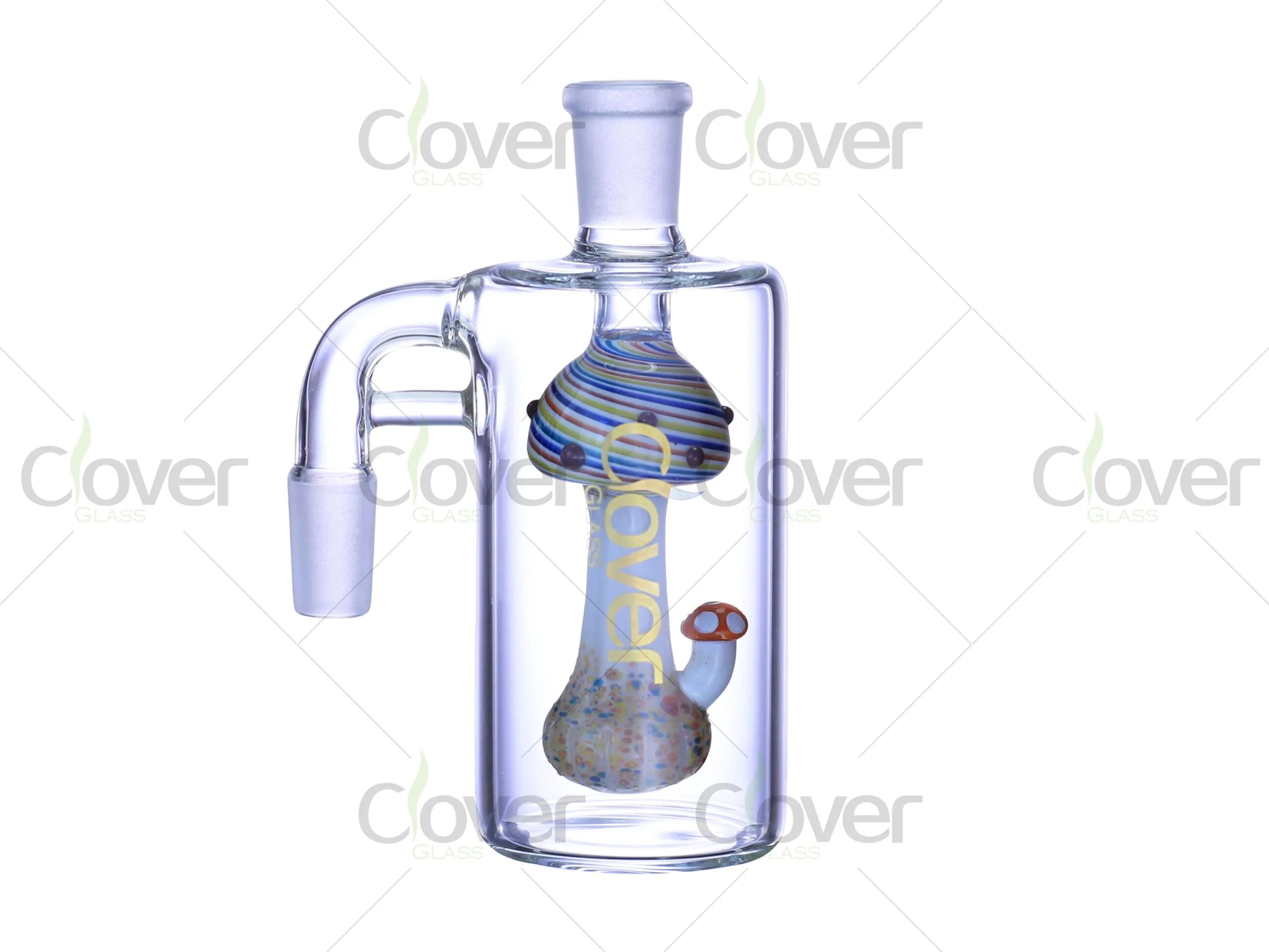 The Clover Glass 5.0-inch Glass Ash Catcher features a whimsical and vibrant mushroom design inside the chamber. Standing at 5.0 inches, this ash catcher is the perfect addition to your rig setup, offering both functional and aesthetic value. With 14mm/18mm male joints, it ensures compatibility with various rigs, and the 90° angle provides stability and comfort during use. Made with 5mm thick glass, this ash catcher is designed for durability and long-lasting performance.