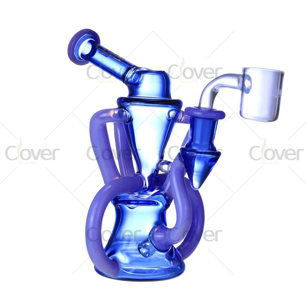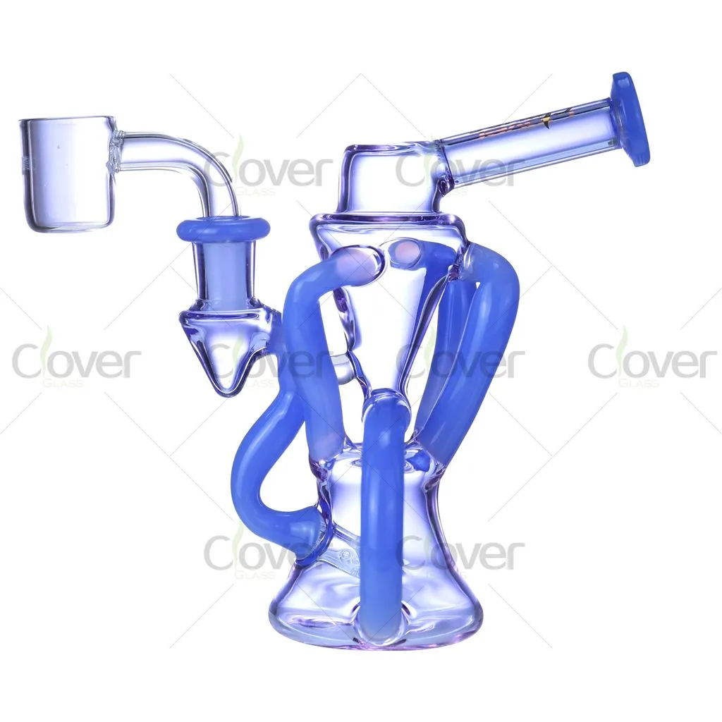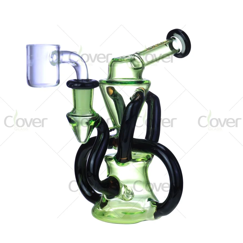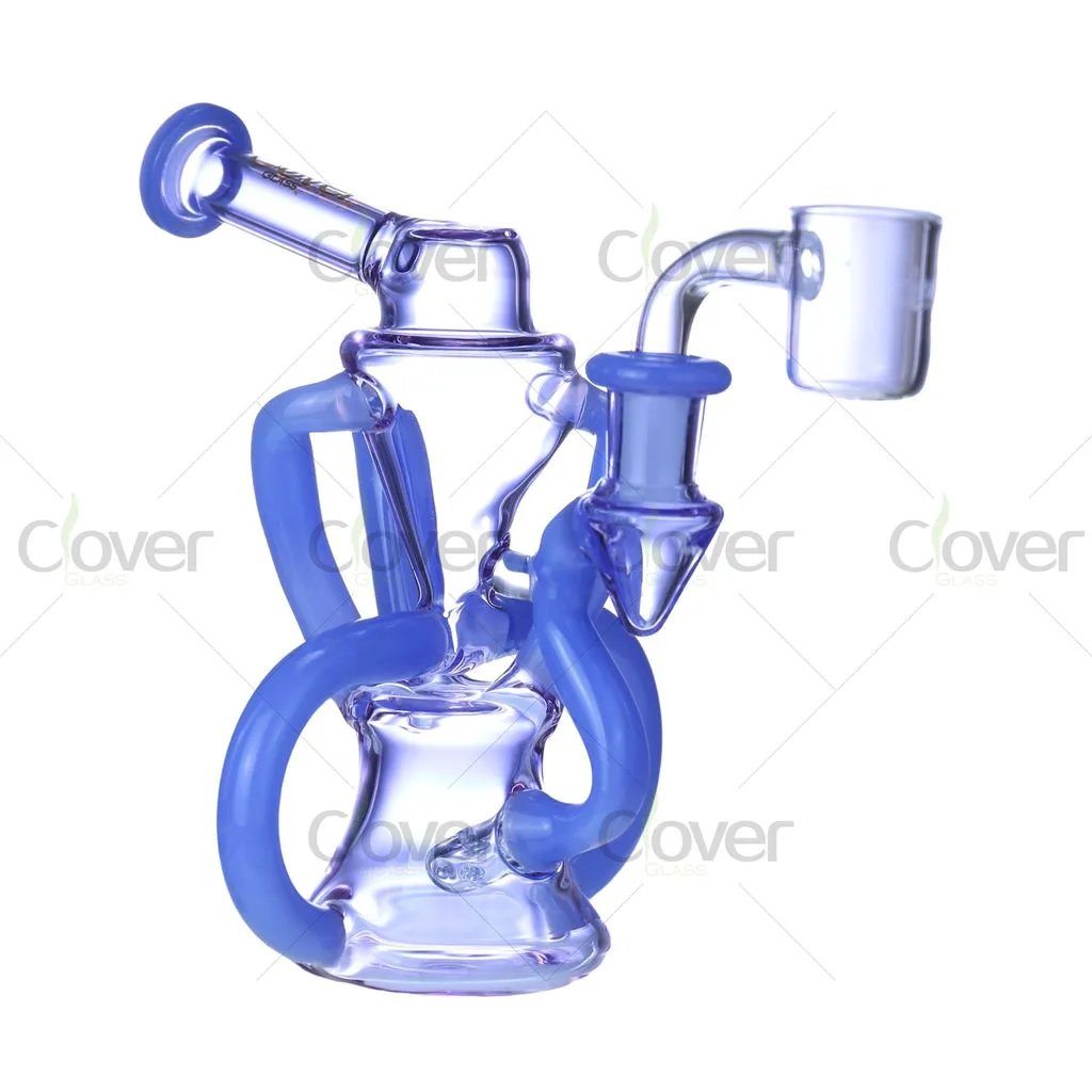 This compact recycler dab rig is crafted from high borosilicate glass and designed for smooth airflow in a small, balanced form.