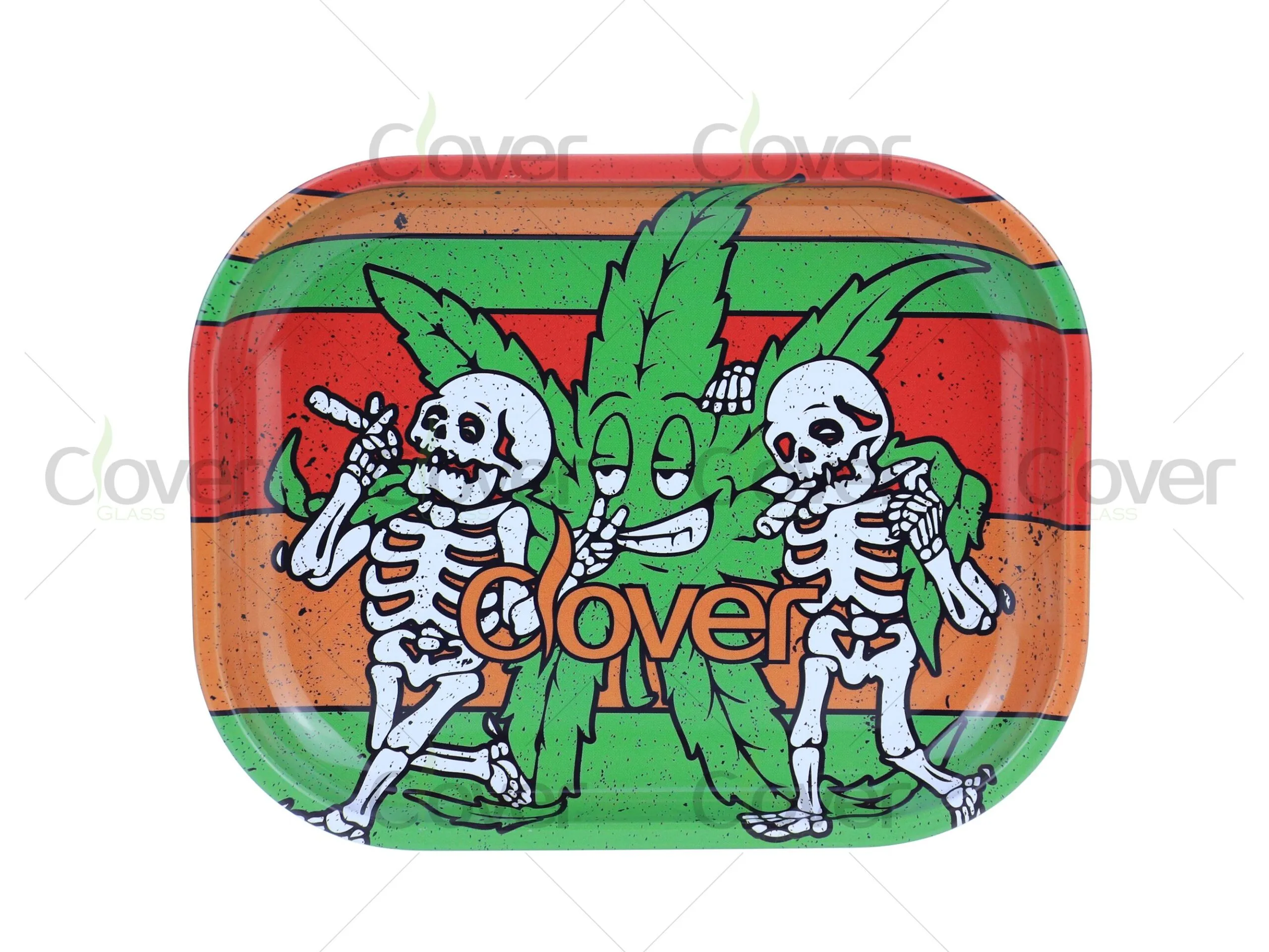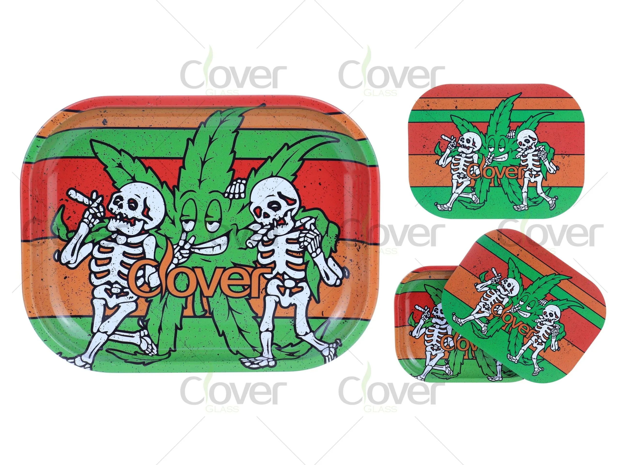 Bring the vibes of reggae and cannabis culture to your shelves with the Rasta Skeleton Rolling Tray Set by Clover Glass. Featuring a cartoon-style stoned cannabis leaf with two dancing skeletons in classic red-yellow-green Rasta stripes, this tray set is a top pick for fans of chill energy and bold visuals.