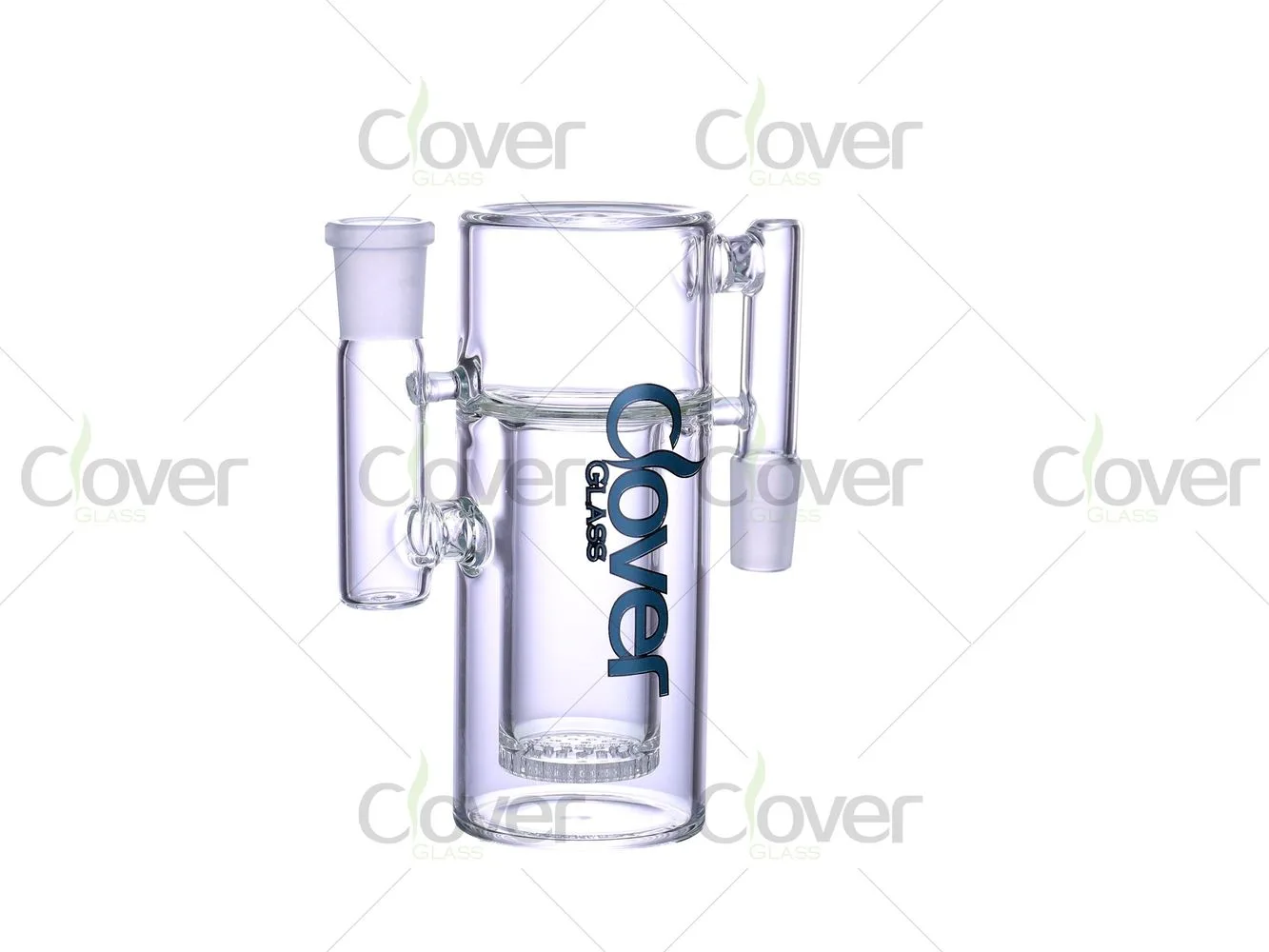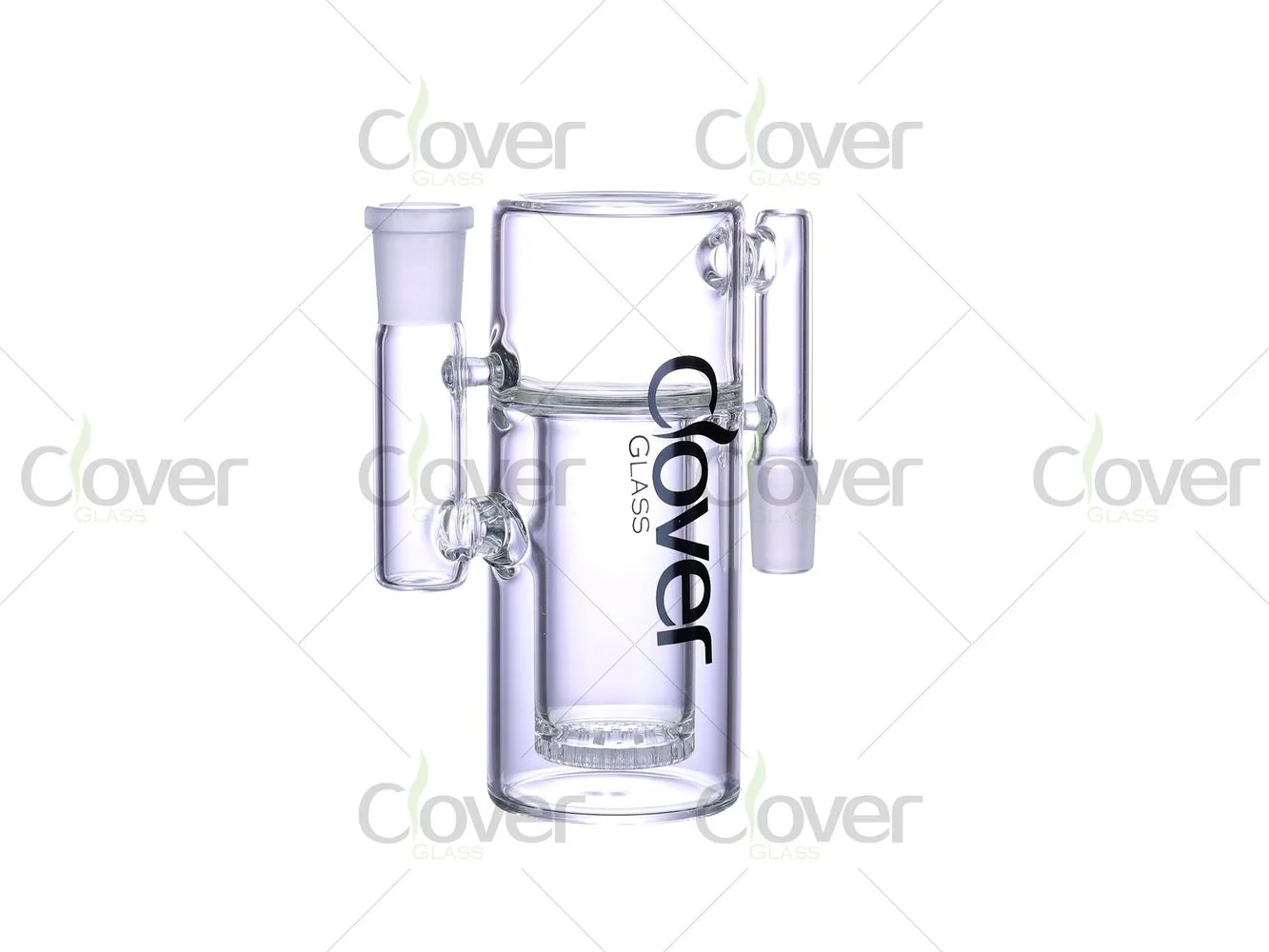 Built from 5mm thick borosilicate glass, the rig offers a solid hand feel and stable standing base. The clear glass body highlights internal function, while the Clover Glass logo is vertically printed for a modern, professional presentation.