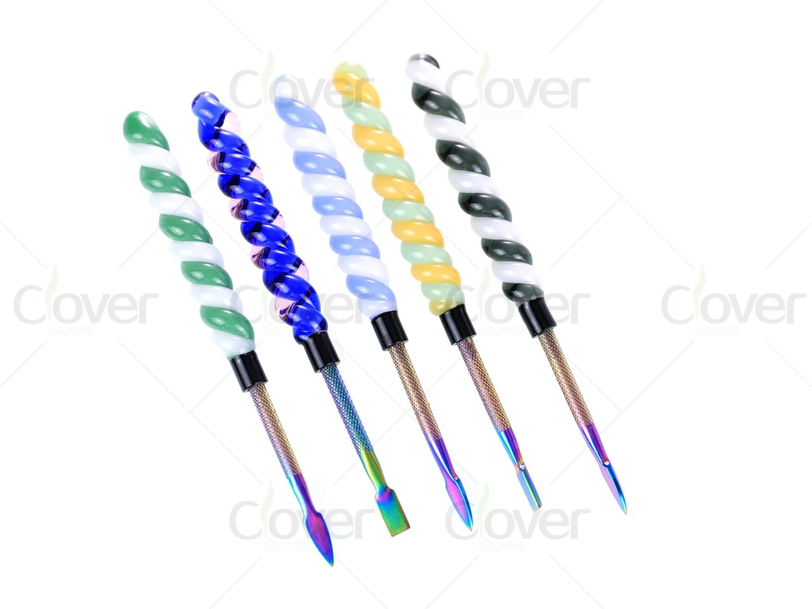 The spiral handle not only enhances aesthetics but also provides a more tactile surface, making it easier to control during concentrate handling. Each piece is crafted from solid colored glass with smooth transitions between colors, giving the tool a premium handcrafted feel.